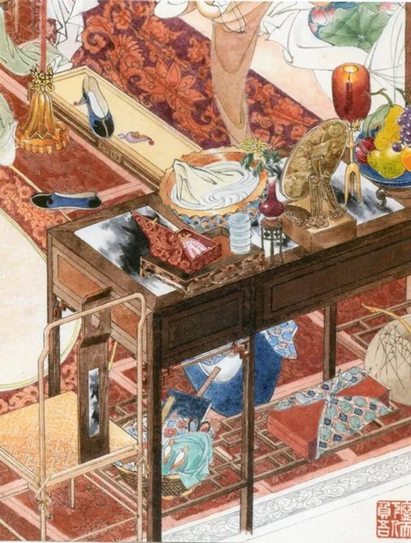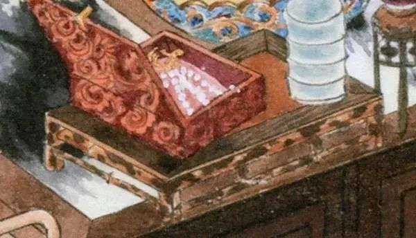 最细腻的描述还有在梳妆台下面放着一个用团锦包裹的礼品盒,疑似西门庆拿来的见面礼。