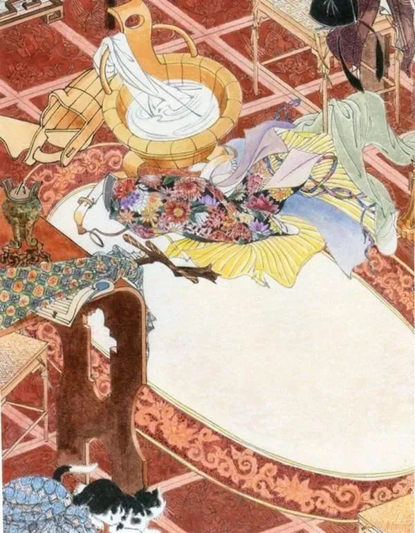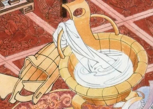 最后一件,靠背坐浴盆,带盖汲水木桶。木桶的设计特别科学,带盖是防溢,凸出的流口是为了导流,俗称“不尿沿”。浴巾和水都是白地黑线却质感分明。