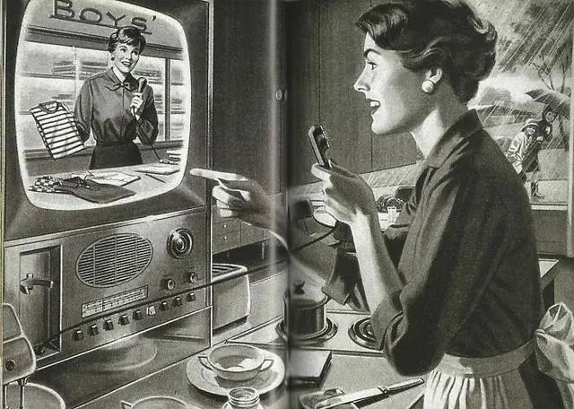 1940年的一幅插画,一位女士坐在电视机前,通过麦克风与电视中的售货员进行对话,来选购自己喜欢的衣服。对当时的人们来说,这都是幻想,但是放在今天,简直是家常便饭。