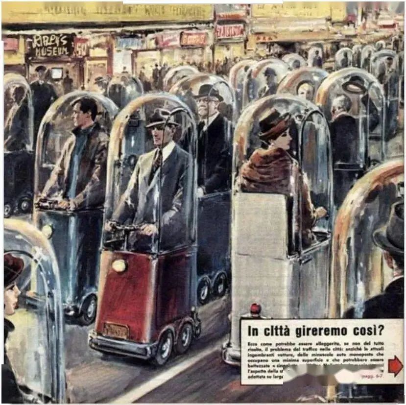 这幅插画名为《2022年的生活》,是画家沃尔特·莫里诺在1962年所画,我们可以看到画中的人们都驾驶着一种单人小型汽车,而且每辆汽车都由全景玻璃密封,人与人之间不再直接接触,画家预测到2022年空气质量太差,或者有某种传染疾病,而导致人们将自己用这种方法保护起来。