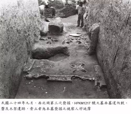 形制描述:墓坑为长方斗形,口大底小形状略同,四壁不甚平整。四周各壁中间有墓道伸出,正好伸向东西南北四方。墓道北道上有脚窝,可能是因为坡度较陡的关系。墓底所建之木室已全部腐化成泥土,木室周壁保存痕迹之高为其他各大墓所不及。可惜挖到地面以下十一公尺深即达到地下水面,以致周壁之最下一公尺及室底地板无法清理。木室各壁尚有耳室向东西南北各方伸出,亦成亚字形。墓坑内西南角有一片木炭坑。天然遗物方面出有人骨、兽骨、兽牙、兽角、鲸鱼骨,石化的象臼齿、蚌壳,人工的则有石玉器、青铜与其他金属器、陶器、骨角牙器、蚌器等,包括完整与残碎者,共约一万数千件。
