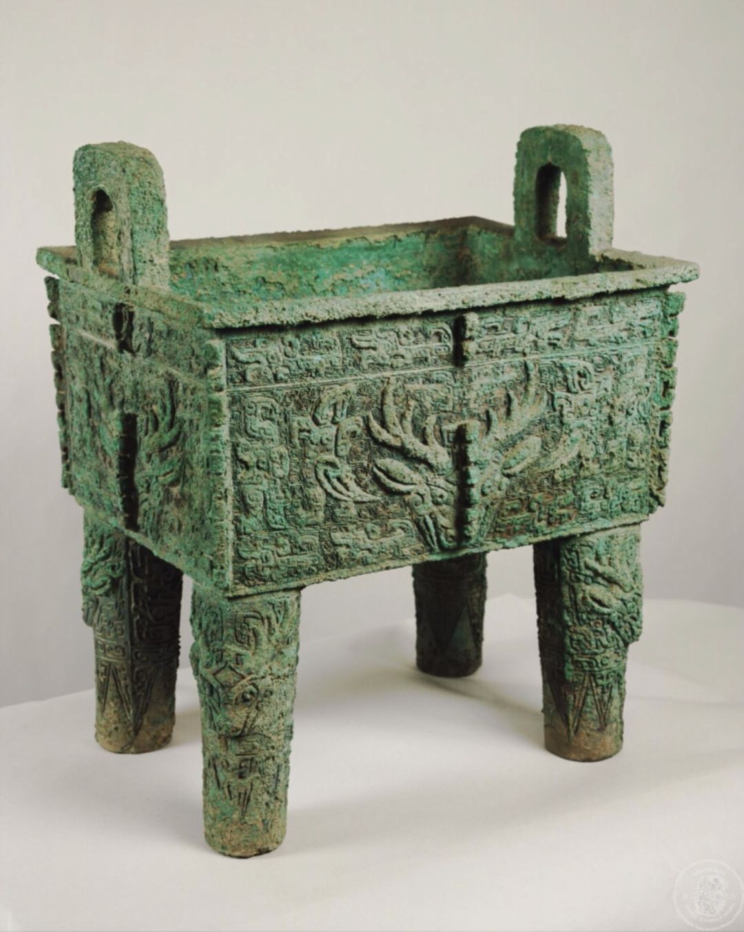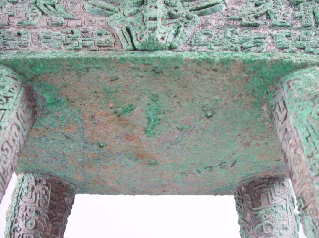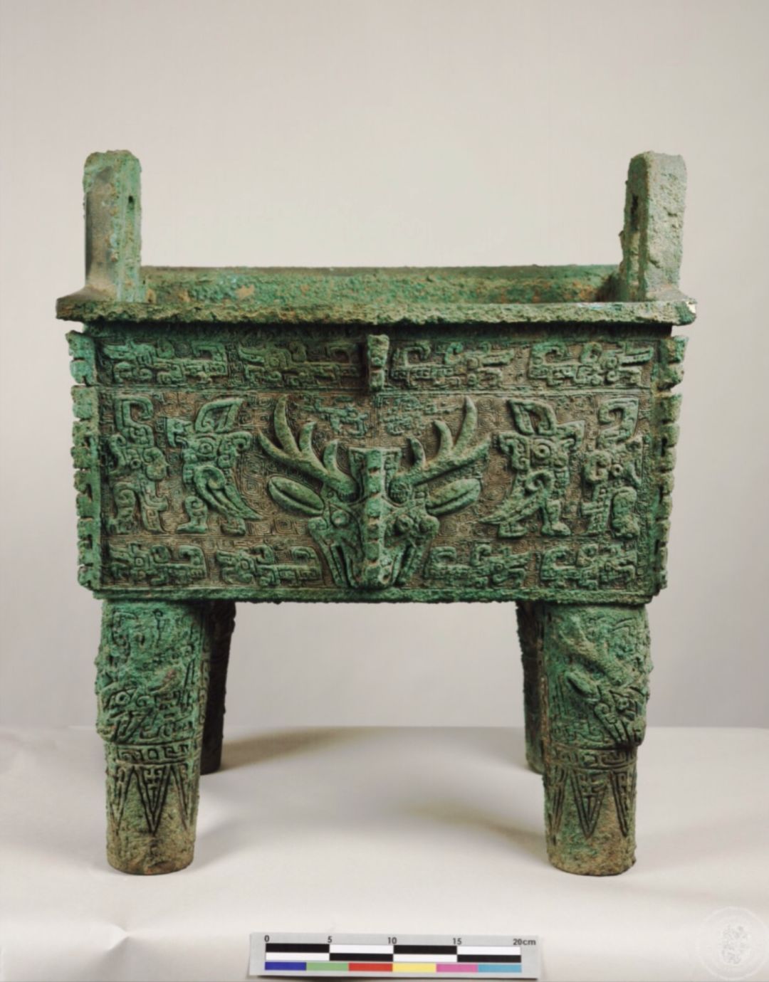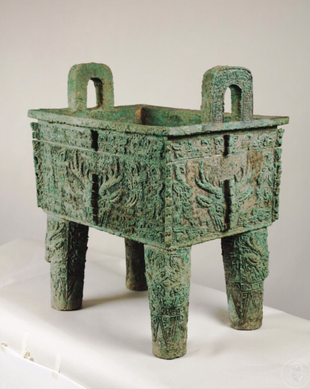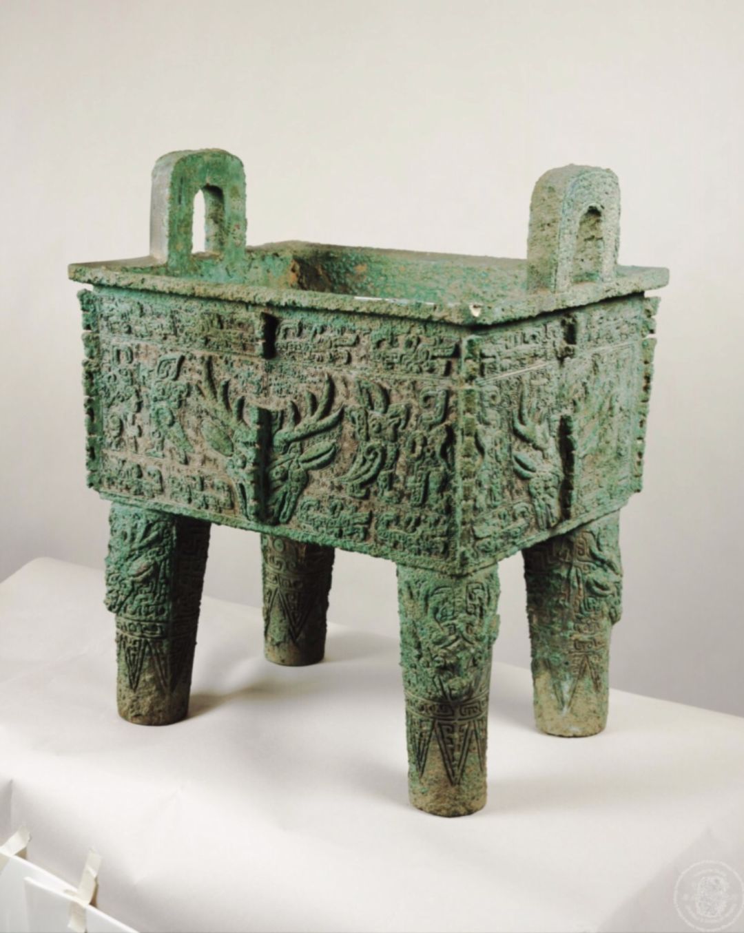 形制描述:与牛方鼎同出于西北冈1004号大墓,体型较牛方鼎小。以鹿首为装饰主纹,鹿角向上分有数叉,鹿首左右两侧也装饰了猛禽类的鸟纹,鹿首上下另有夔龙纹。值得注意的是,夔龙纹及鸟纹均面朝器物的外侧。鼎足空心,足部上方也以鹿首装饰,器内底并铸有鹿形铭文。商代彝器没有其他以鹿做铭文的例子。