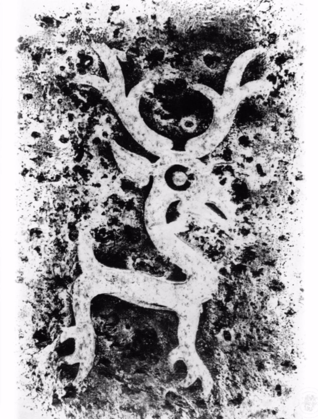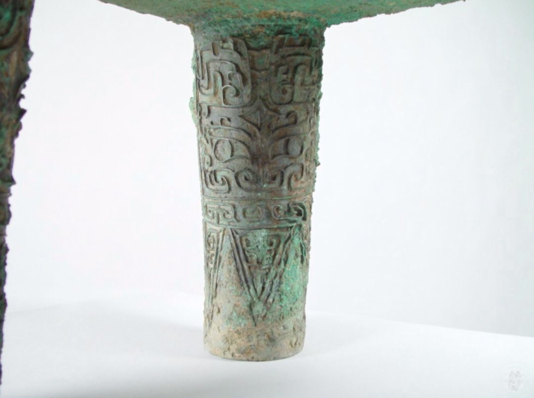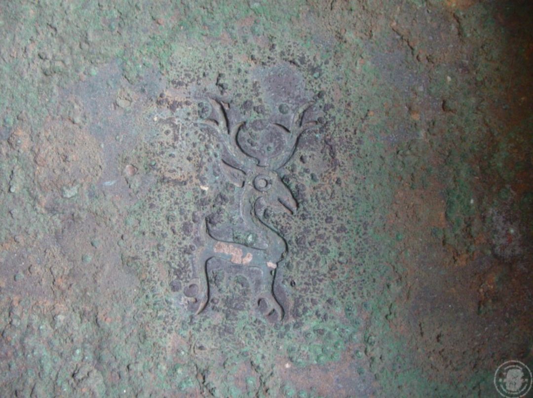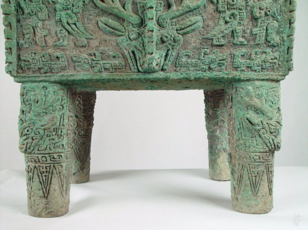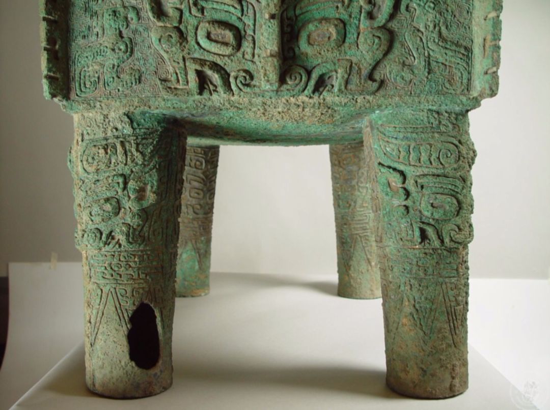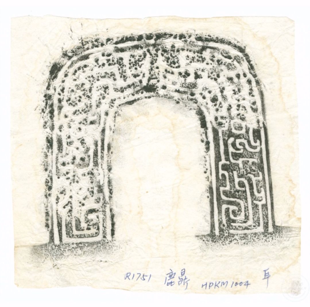 形制描述:与牛方鼎同出于西北冈1004号大墓,体型较牛方鼎小。以鹿首为装饰主纹,鹿角向上分有数叉,鹿首左右两侧也装饰了猛禽类的鸟纹,鹿首上下另有夔龙纹。值得注意的是,夔龙纹及鸟纹均面朝器物的外侧。鼎足空心,足部上方也以鹿首装饰,器内底并铸有鹿形铭文。商代彝器没有其他以鹿做铭文的例子。