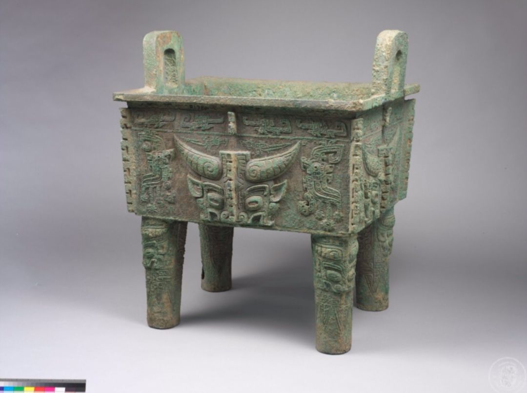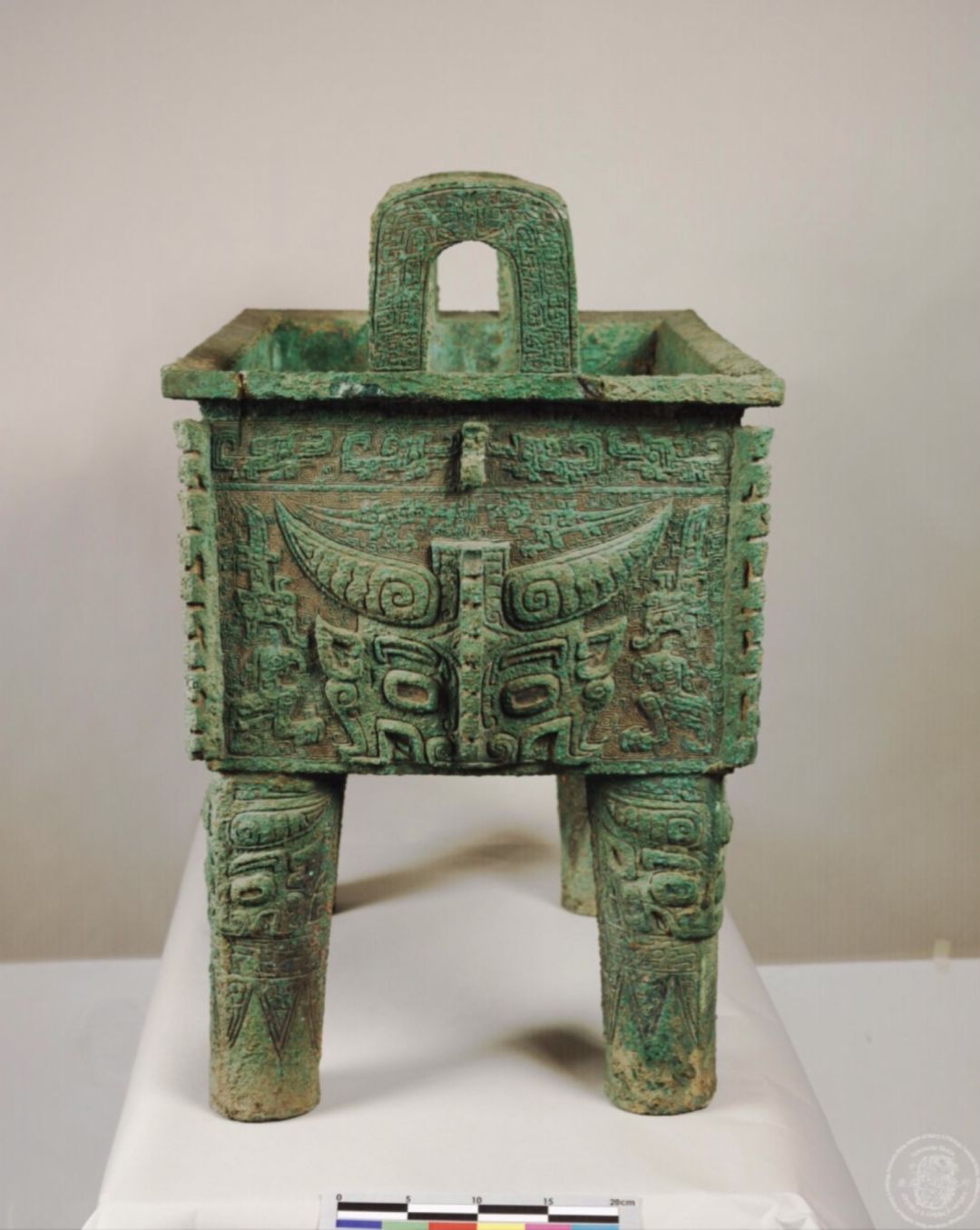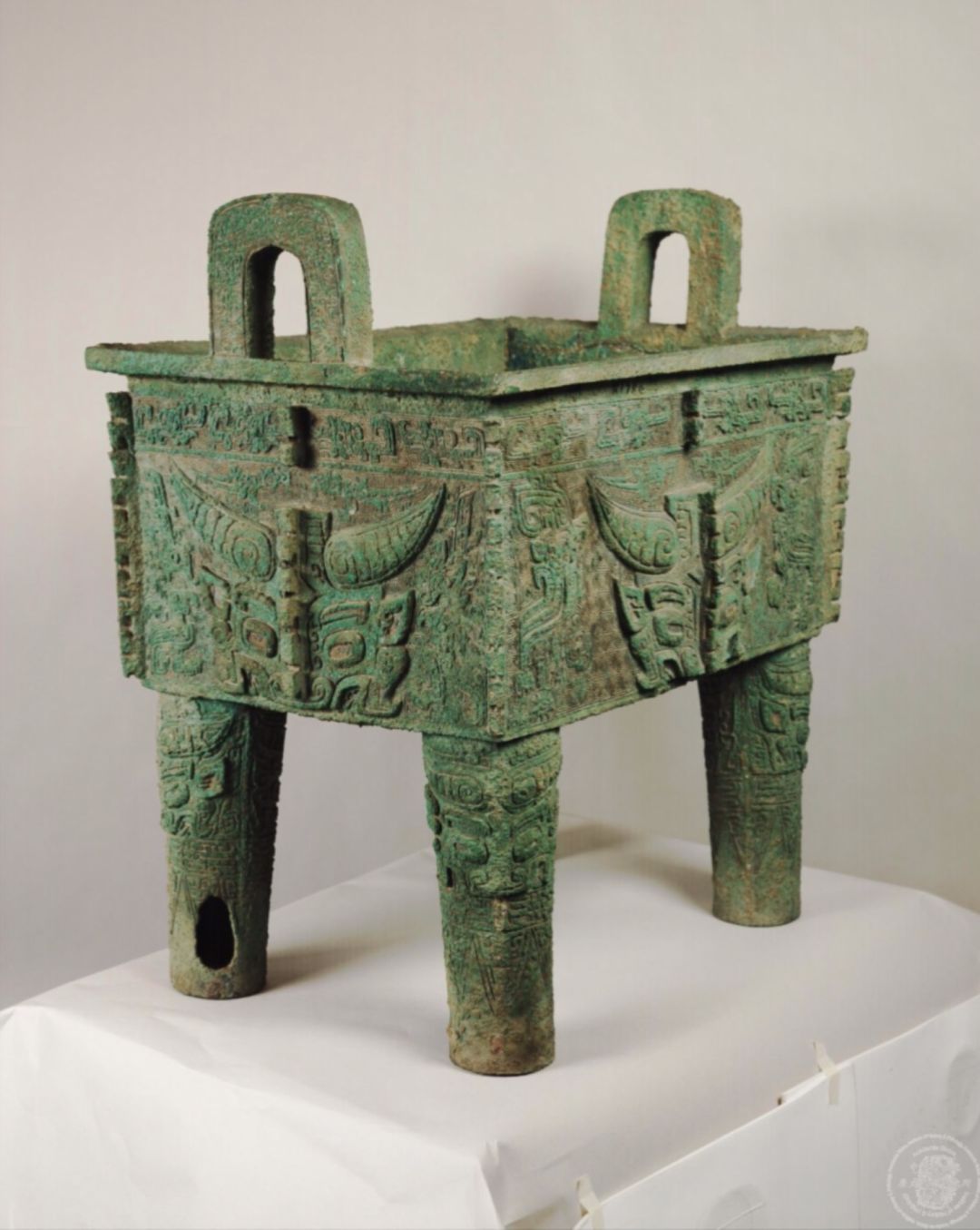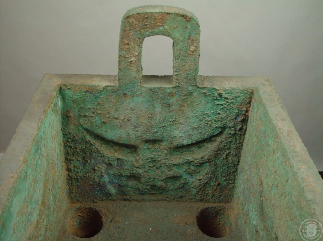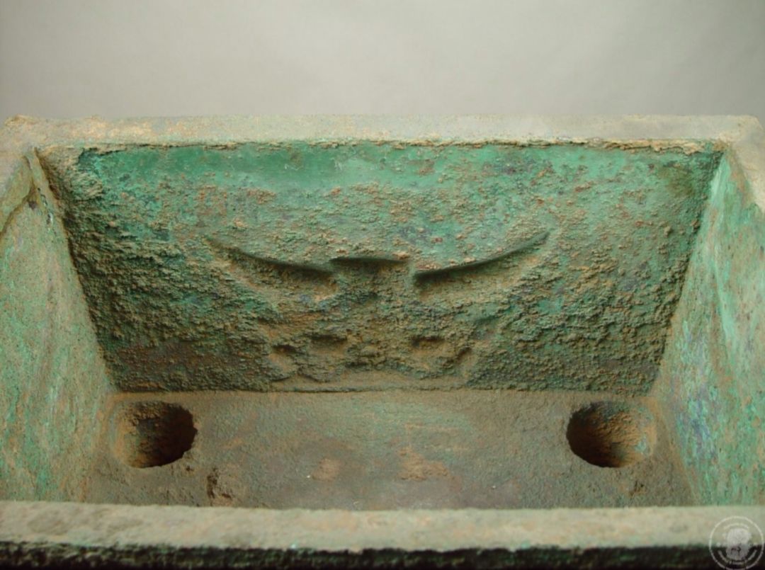形制描述:出土于西北冈1004号大墓南墓道北端与墓室交界处,出土时与鹿方鼎并置。长方形,四足两耳,唇缘外撇,器身四角及中间均有扉棱,四足中空,自上俯视可见器内底有四个孔洞。腹部四壁与四足上部都装饰了大而立体的牛首纹饰,由牛角型态可知为水牛,因称之为牛方鼎。器长边面上的牛首两侧装饰了冠羽飞扬的猛禽。器内底部有牛形铭文。本器为现存殷代方鼎中少数的大型品。