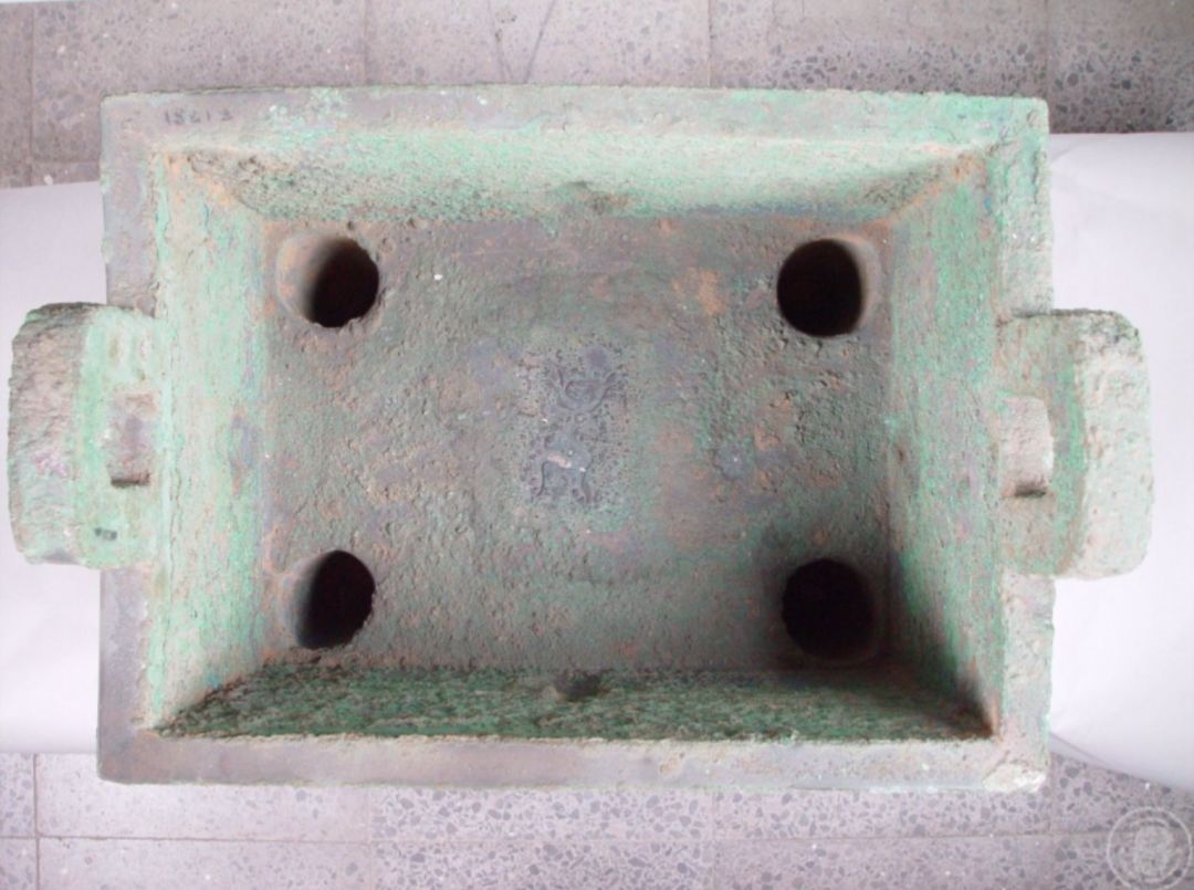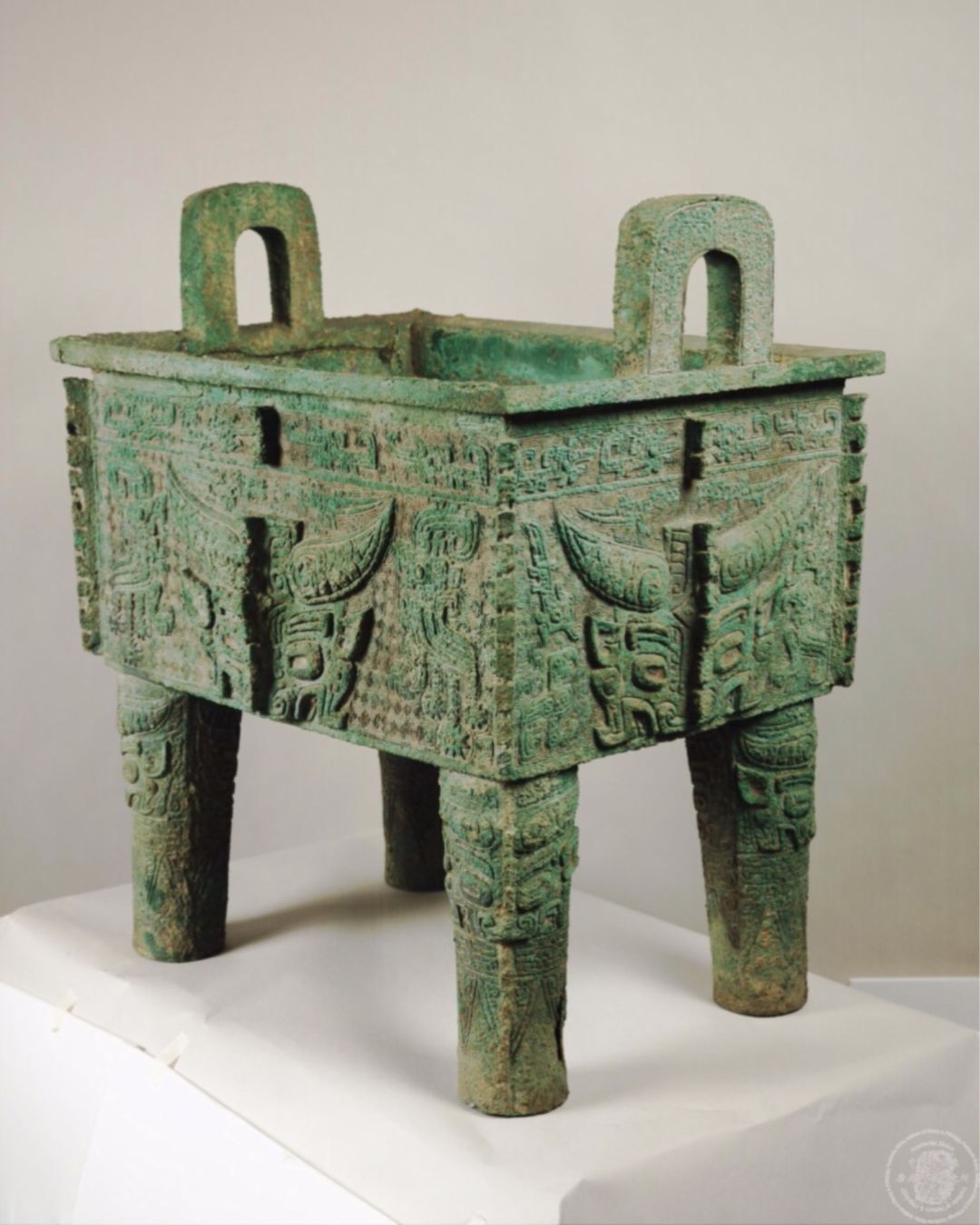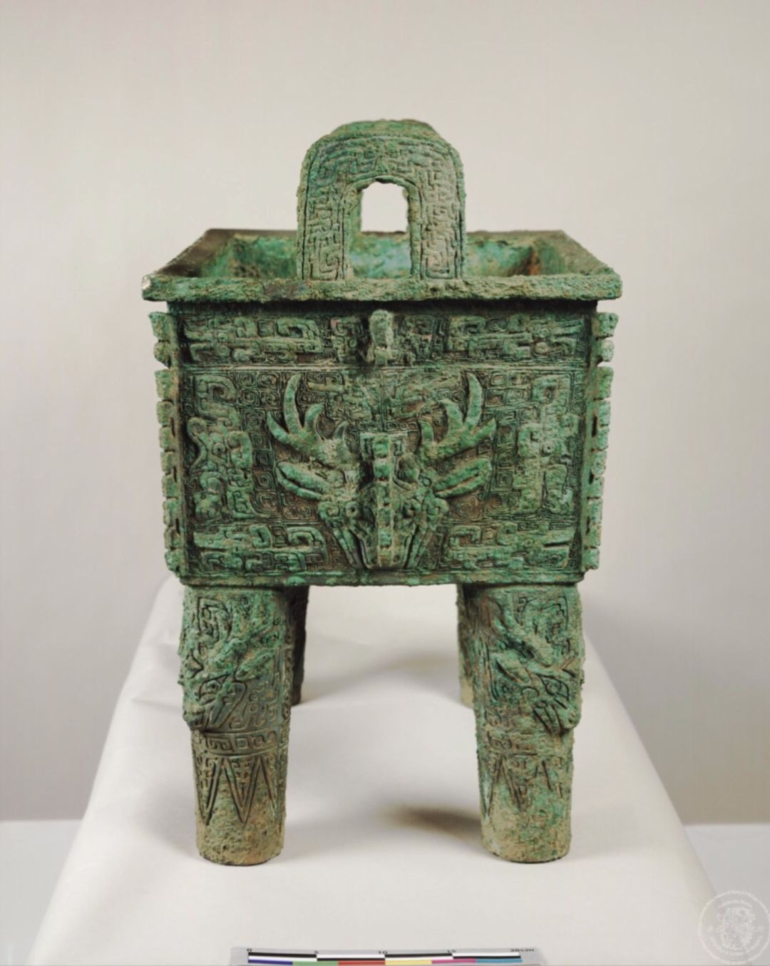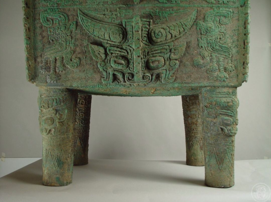 形制描述:出土于西北冈1004号大墓南墓道北端与墓室交界处,出土时与鹿方鼎并置。长方形,四足两耳,唇缘外撇,器身四角及中间均有扉棱,四足中空,自上俯视可见器内底有四个孔洞。腹部四壁与四足上部都装饰了大而立体的牛首纹饰,由牛角型态可知为水牛,因称之为牛方鼎。器长边面上的牛首两侧装饰了冠羽飞扬的猛禽。器内底部有牛形铭文。本器为现存殷代方鼎中少数的大型品。
