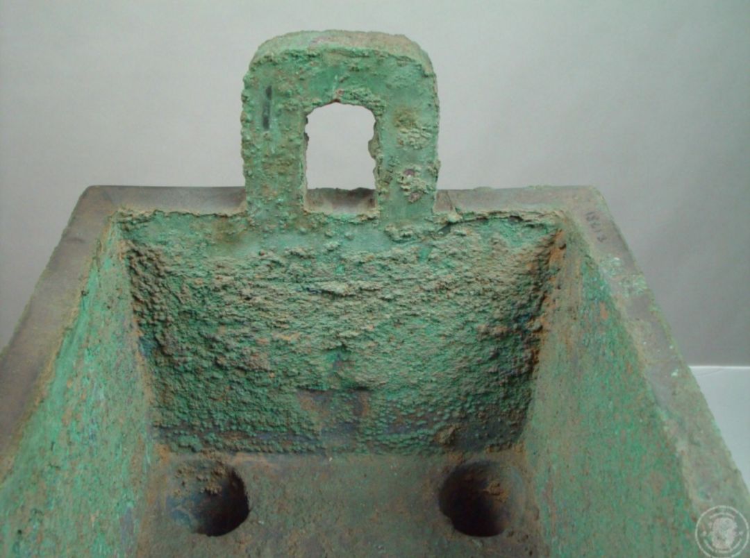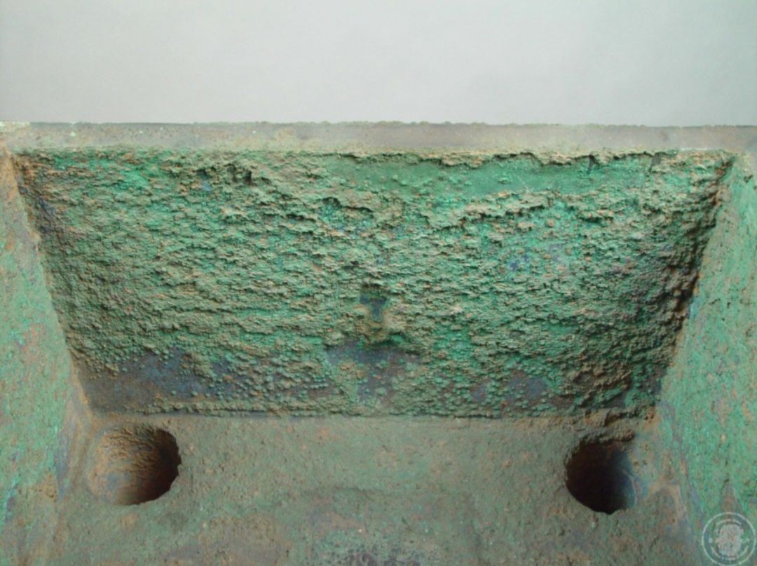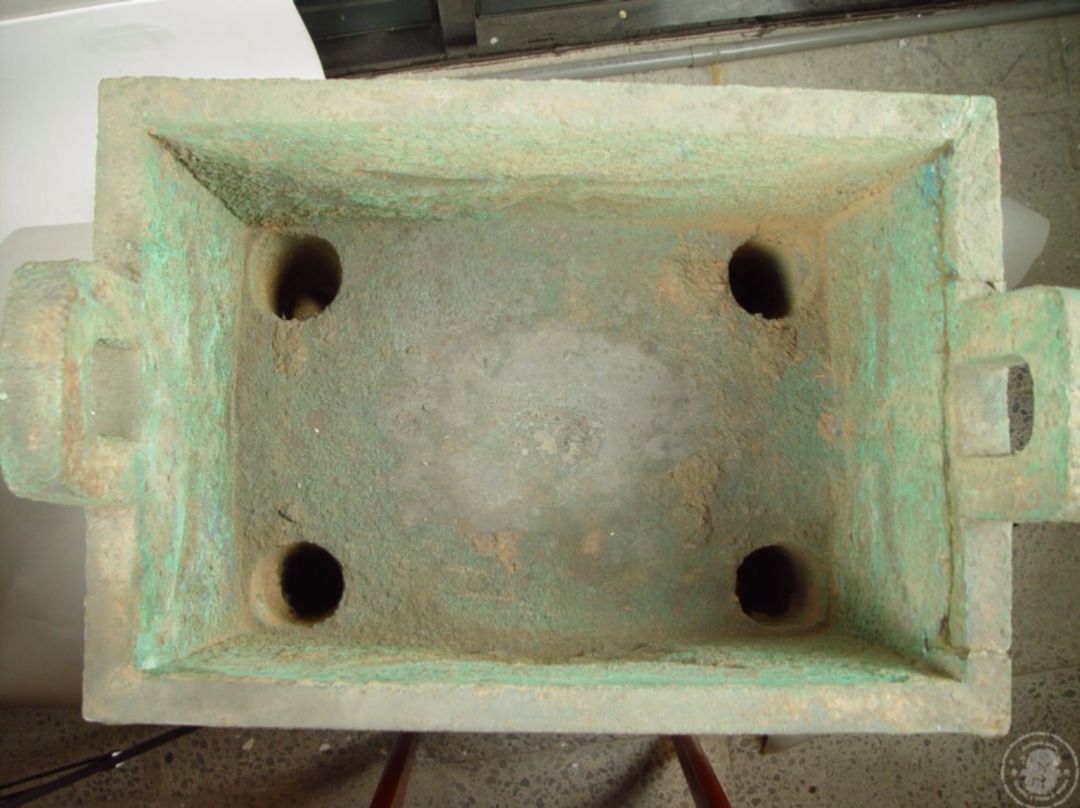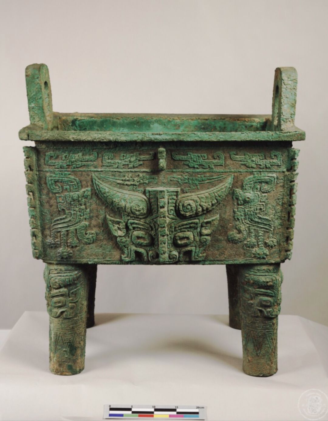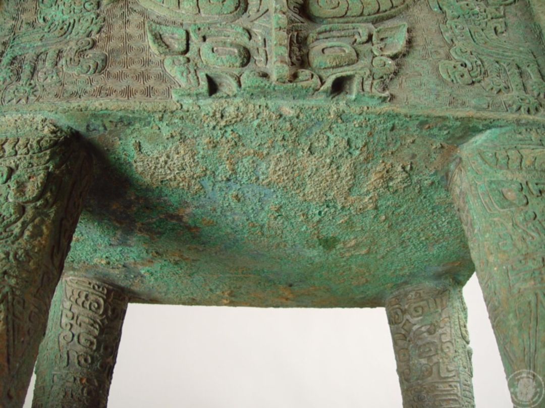 形制描述:出土于西北冈1004号大墓南墓道北端与墓室交界处,出土时与鹿方鼎并置。长方形,四足两耳,唇缘外撇,器身四角及中间均有扉棱,四足中空,自上俯视可见器内底有四个孔洞。腹部四壁与四足上部都装饰了大而立体的牛首纹饰,由牛角型态可知为水牛,因称之为牛方鼎。器长边面上的牛首两侧装饰了冠羽飞扬的猛禽。器内底部有牛形铭文。本器为现存殷代方鼎中少数的大型品。