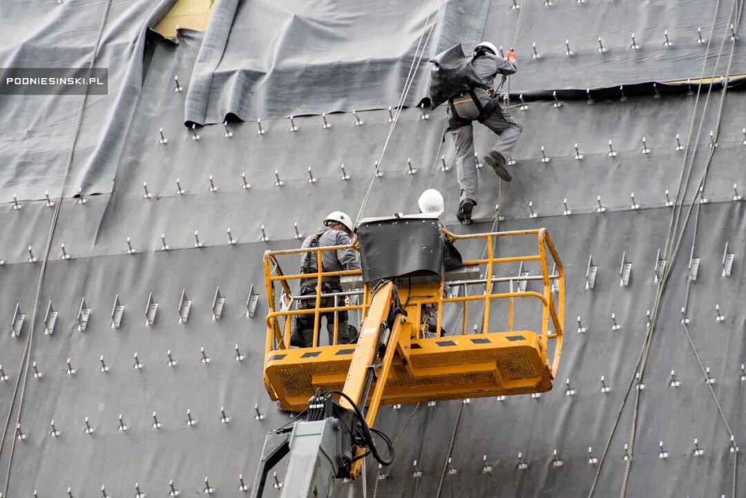 2015年7月,工人正在新石棺屋顶工作。
