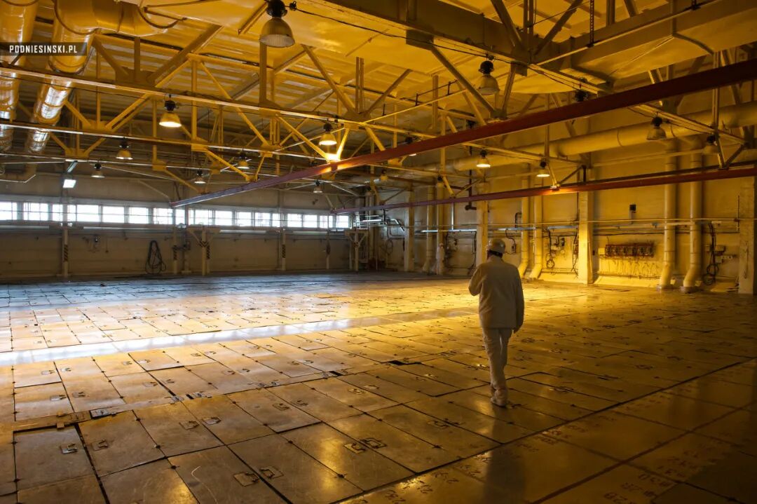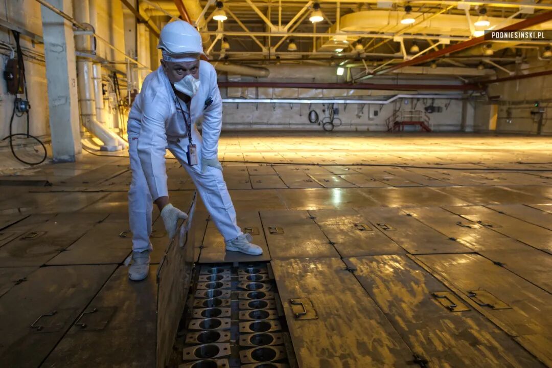 工程师走在乏燃料池上。巨大的乏燃料池由数百个钢板所覆盖。