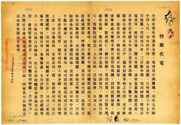 二战结束时,《开罗宣言》与《波茨坦公告》已经剥夺了日本对琉球的占有权。1943年12月1日发表的《开罗宣言》庄严宣告,“三国之宗旨在剥夺日本自1914年第一次世界大战开始后,在太平洋上所夺得或占领之一切岛屿,及使日本在中国所窃取之领土,如东北四省、台湾、澎湖列岛等归还中华民国。其他日本以武力或贪欲所攫取之土地亦务将日本驱逐出境。”请注意最后一句指的就是琉球。因为罗斯福已提出琉球问题,但早前没有谈妥,所以如此表述。《波茨坦公告》则明确规定日本领土限于四大岛及一些小岛。