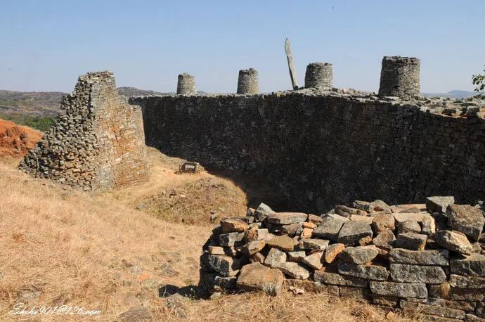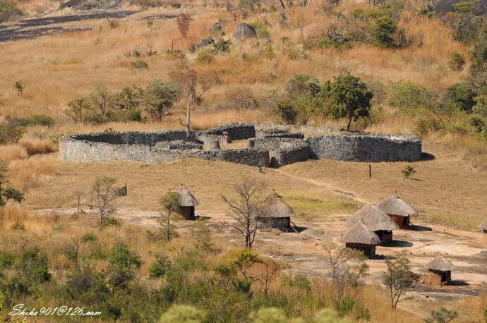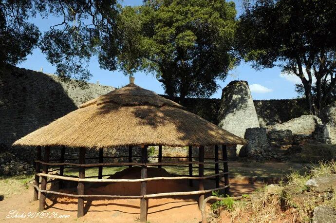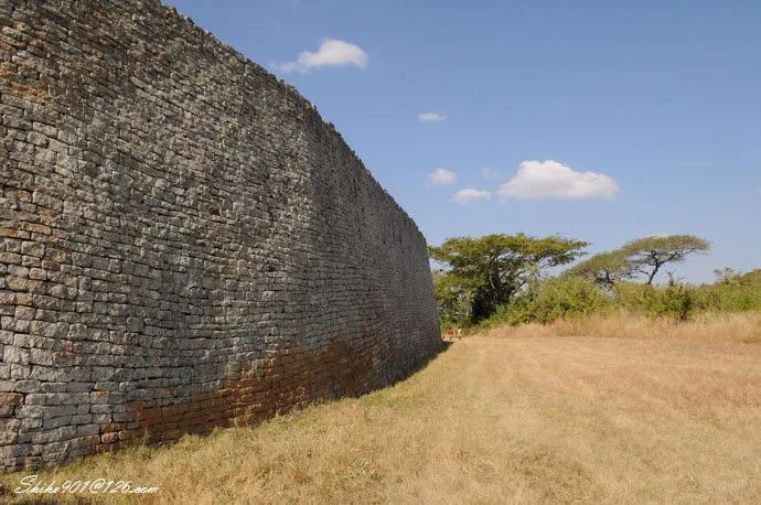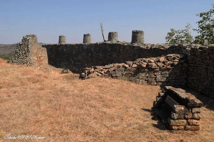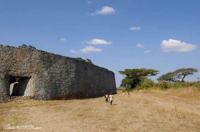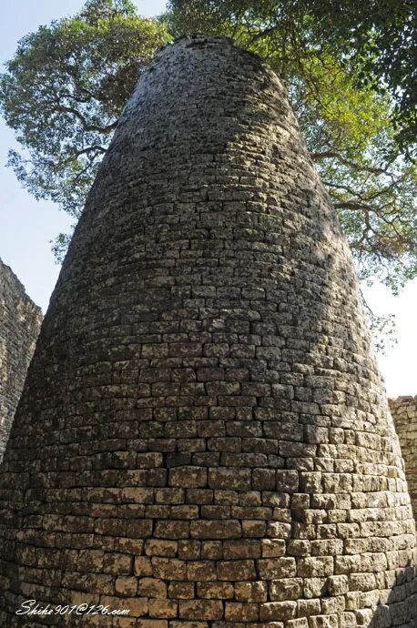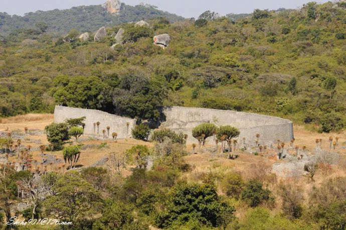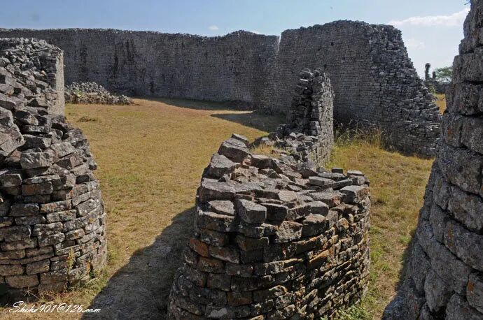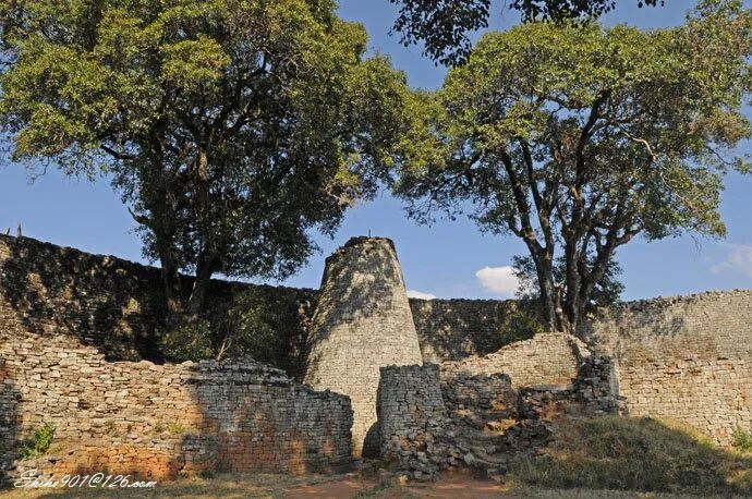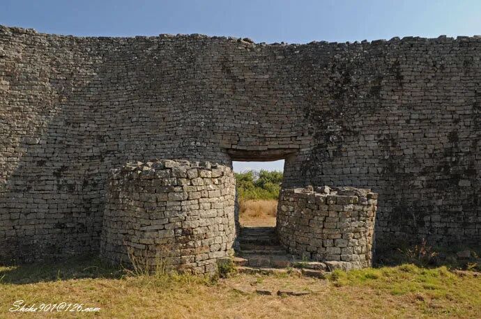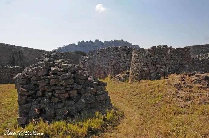 其二,大津巴布韦的“围场”。位于平地上的这一椭圆形建筑物的构造和工艺确实是匪夷所思。整个椭圆形建筑长约52米,围墙总长为244米,四周围墙的平均高度为7.3米,围墙本身底部约5.5米厚,顶部为1.3—3.6米厚。建筑物里发现了鸟状徽记和皂石雕刻。这些围墙用花岗岩石块垒起,总共约有5,151立方米的石头,整座围墙未用灰浆,却非常坚实。围墙里面还有一条似乎未完工的内墙,两堵围墙之间形成了一条狭窄的通道,一直通向围场内建筑精致细腻的锥形石塔。大围场内还分为若干个小围场,可能是大津巴布韦统治者的住处。