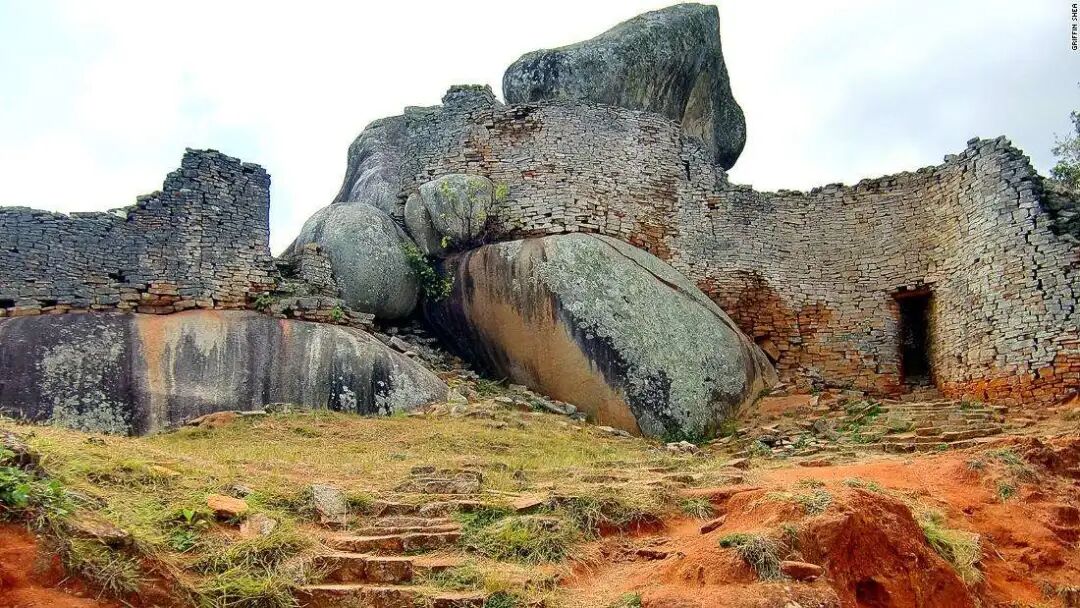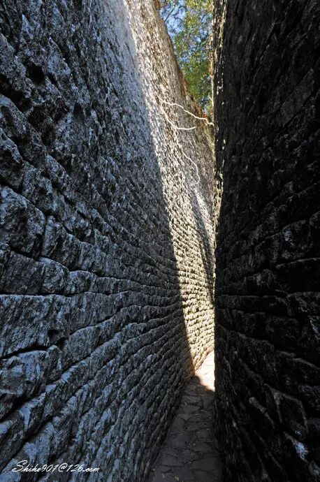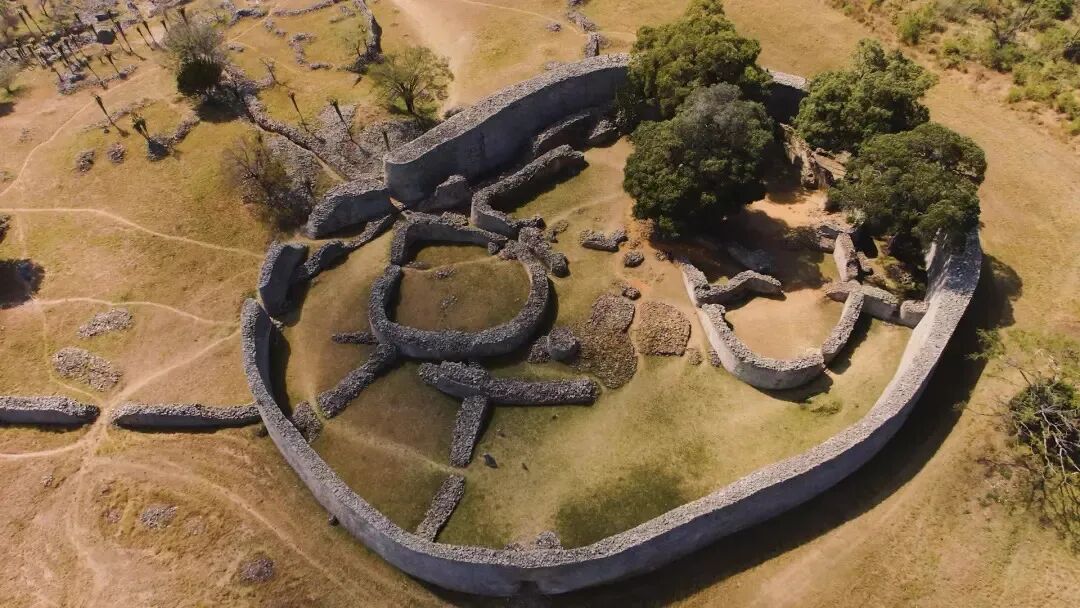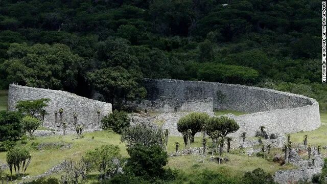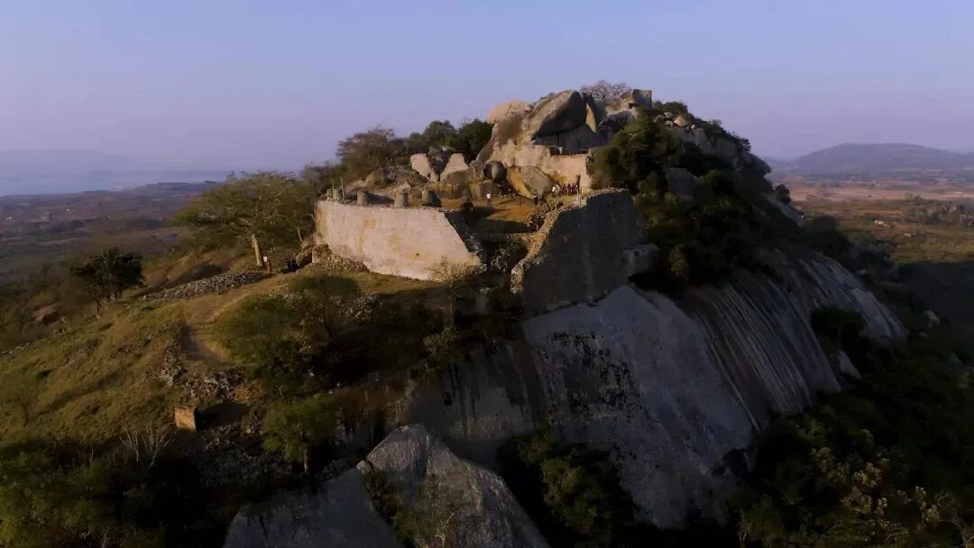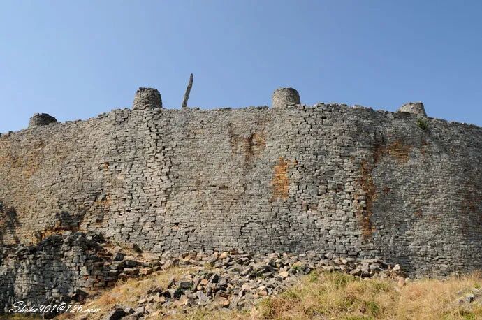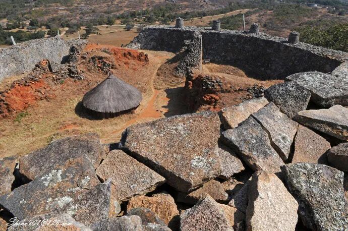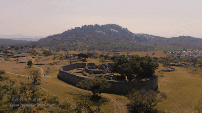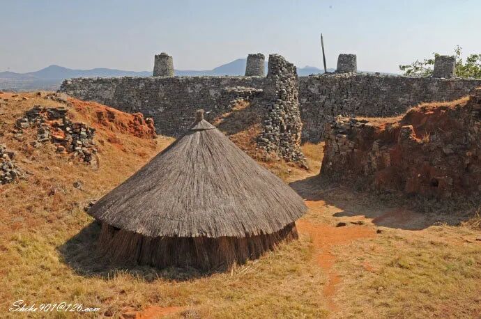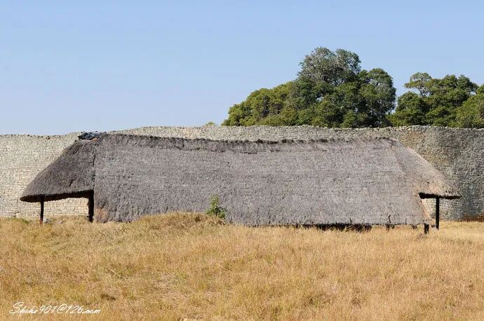 其二,大津巴布韦的“围场”。位于平地上的这一椭圆形建筑物的构造和工艺确实是匪夷所思。整个椭圆形建筑长约52米,围墙总长为244米,四周围墙的平均高度为7.3米,围墙本身底部约5.5米厚,顶部为1.3—3.6米厚。建筑物里发现了鸟状徽记和皂石雕刻。这些围墙用花岗岩石块垒起,总共约有5,151立方米的石头,整座围墙未用灰浆,却非常坚实。围墙里面还有一条似乎未完工的内墙,两堵围墙之间形成了一条狭窄的通道,一直通向围场内建筑精致细腻的锥形石塔。大围场内还分为若干个小围场,可能是大津巴布韦统治者的住处。