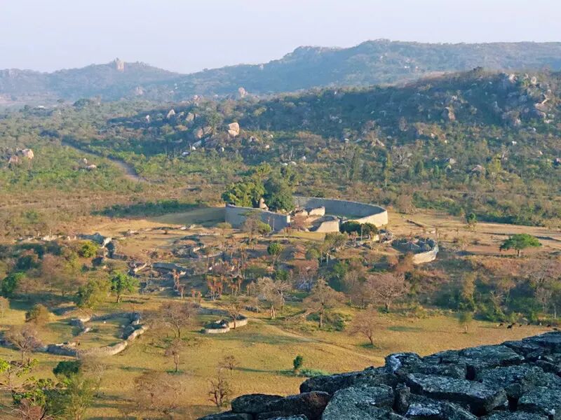 高原之上还有许多津巴布韦或“石头房”。西边的邻国博茨瓦纳也有这样的房子,而东边,从沿海的平原一直到莫桑比克还有少许石头房。大津巴布韦是这些石屋中最大的建筑,津巴布韦国家正是以此命名。把大津巴布韦作为首都的王国统治着广大的地域,王国的强大要归功于对黄金的控制,这里的黄金主要出口到斯瓦希里沿岸地区。但是可能要给此处提到的“王国”加上引号:我们不知道——或者可以说几乎不知道这个地方的政治与社会结构。王国的权力是呈金字塔状,还是与津巴布韦一样是领主分封制?同时还要为“首都”加上引号。我们确认在高原中发现的绝大部分进口陶瓷的碎片都位于大津巴布韦,这意味着它的地位尊贵。这是毫无疑问的,但如果其他某些津巴布韦也发现了陶瓷的碎片,那么就得另当别论了。