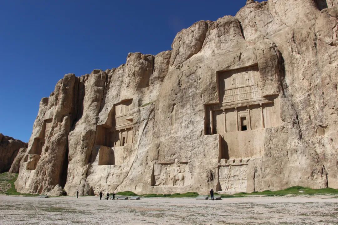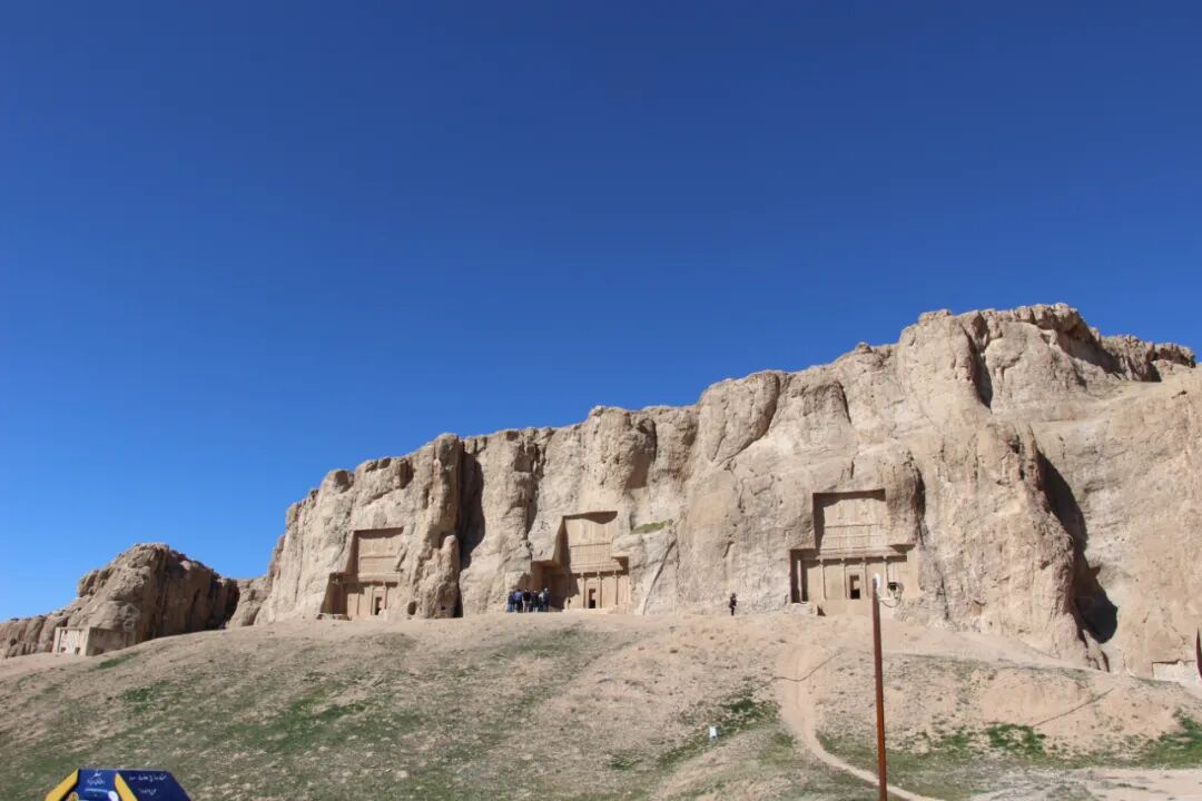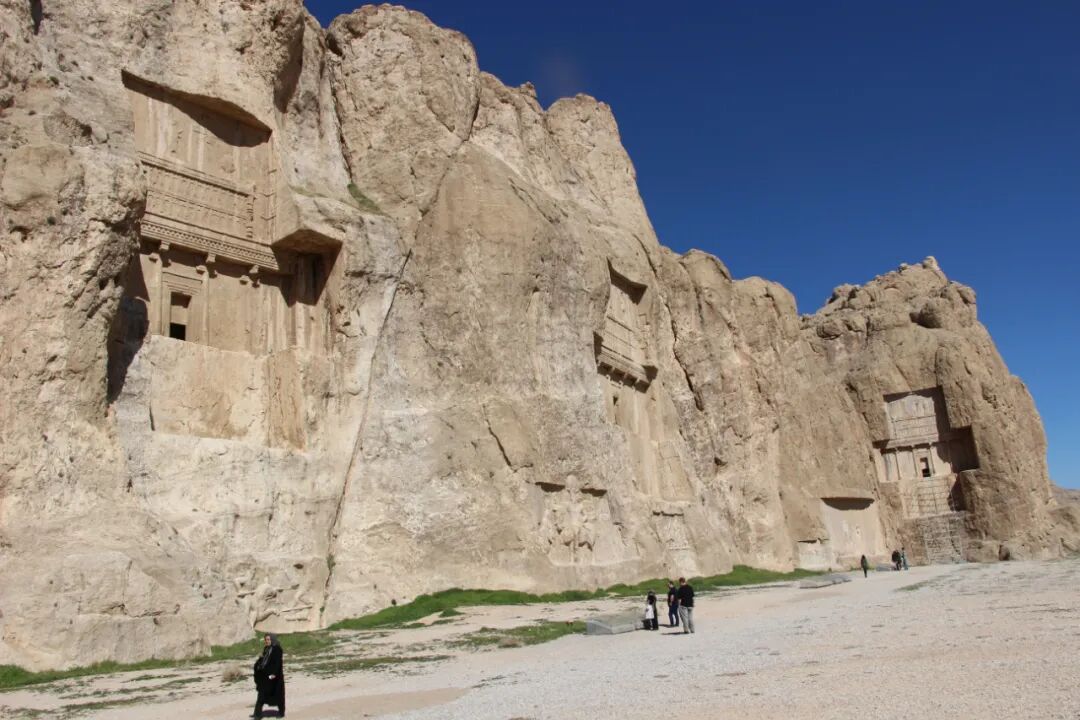波斯帝陵和萨珊浮雕,波斯帝国四位君王的陵墓:陵墓本身叫Necropolis。位于距波斯波利斯西北12公里处的一座山崖上。波斯帝陵建造在山体的岩壁上,四个十字形陵墓高高的半悬于岩壁上,依次排开,从右到左分属薛西斯一世(Xerxes the Great,前485年—前465年在位)、大流士一世(Darius I the Great,公元前521—前485年在位)、阿塔薛西斯一世(Artaxerxes I,公元前465年—公元前424年在位)和大流士二世(Darius II,公元前423年 — 公元前404年在位)。空旷的大地,一块高耸的峭壁,四个墓穴,七幅萨珊时期的浮雕,这些配合在一起的画面只能用视觉冲击来描述。