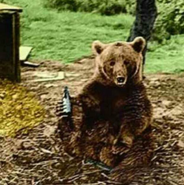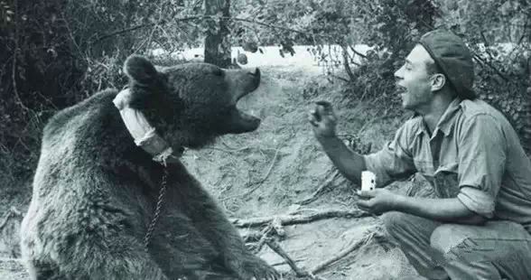 但熊孩子毕竟是熊孩子,在士兵们的熏陶下,没多久小家伙就被带歪了。它学会了抽烟喝酒,并喜欢上了酒精的味道,经常晕头晕脑的在营地里晃来晃去。后来竟然还会主动索要香烟和酒~~看这个握瓶子姿势,标准不?