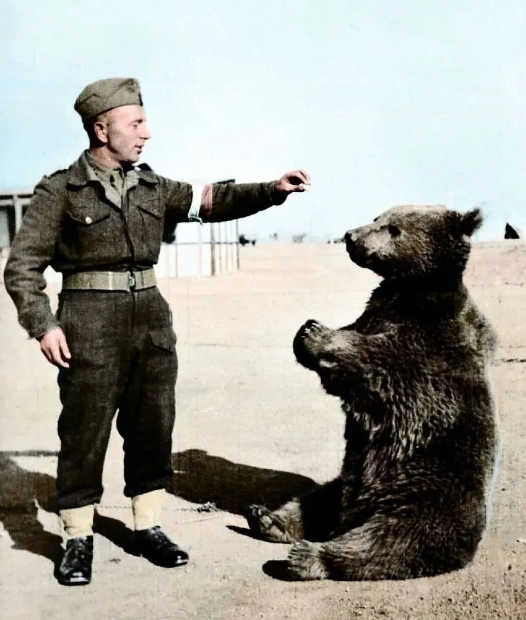 4月8日那天,几个波兰士兵在伊朗的哈马丹火车站碰到一名伊朗男孩,他正在卖一只小熊。它的母亲之前被猎人射杀,小熊看上十分惊恐和害怕。。
