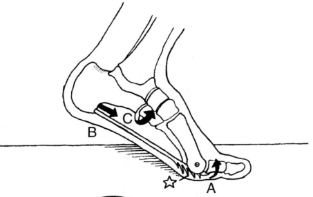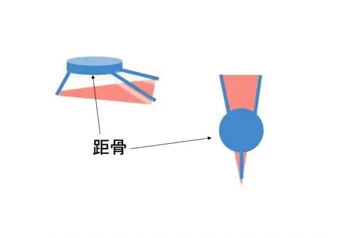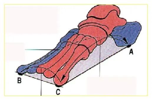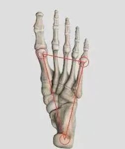第1跖骨、第五跖骨、跟骨三柱中任何一个或两个的升高或降低会使此结构倾斜,引起足部力学不稳定。