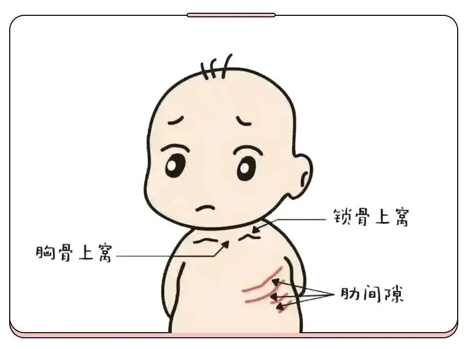 ④呼吸困难,鼻孔张开使劲呼吸,胸骨上窝,锁骨上窝,及肋骨间隙在呼吸时向内凹陷,出现三凹征是重症肺炎的体征。