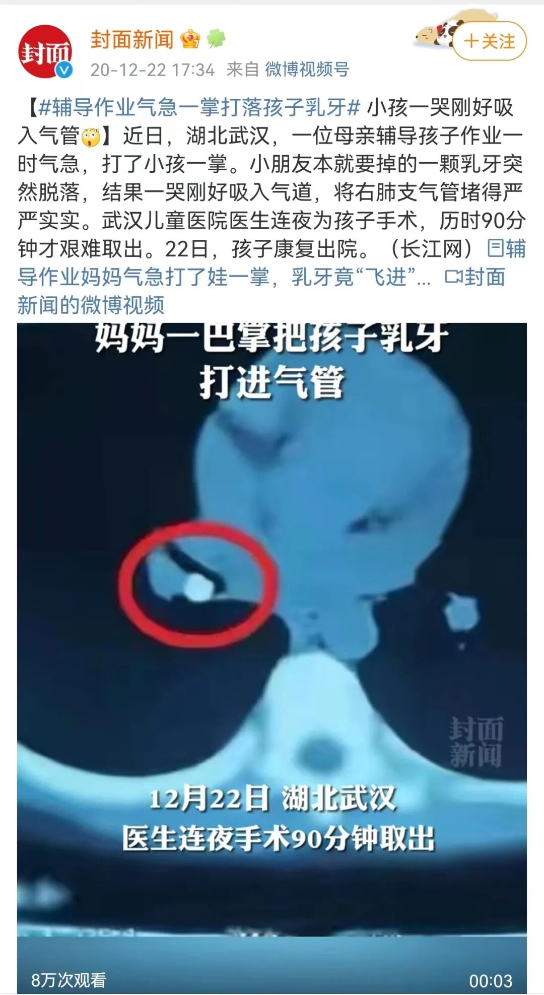 🔽母亲辅导作业气急,一巴掌打落孩子乳牙