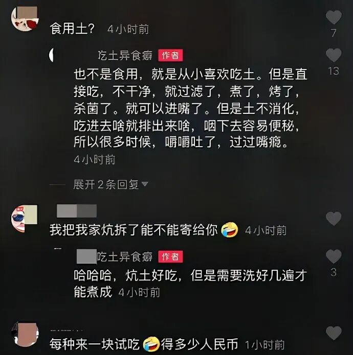 某音上就有很多这样的up主,他们不光喜欢吃土,还对各种土的口感和味道做点评,因为猎奇也吸引来一些关注。