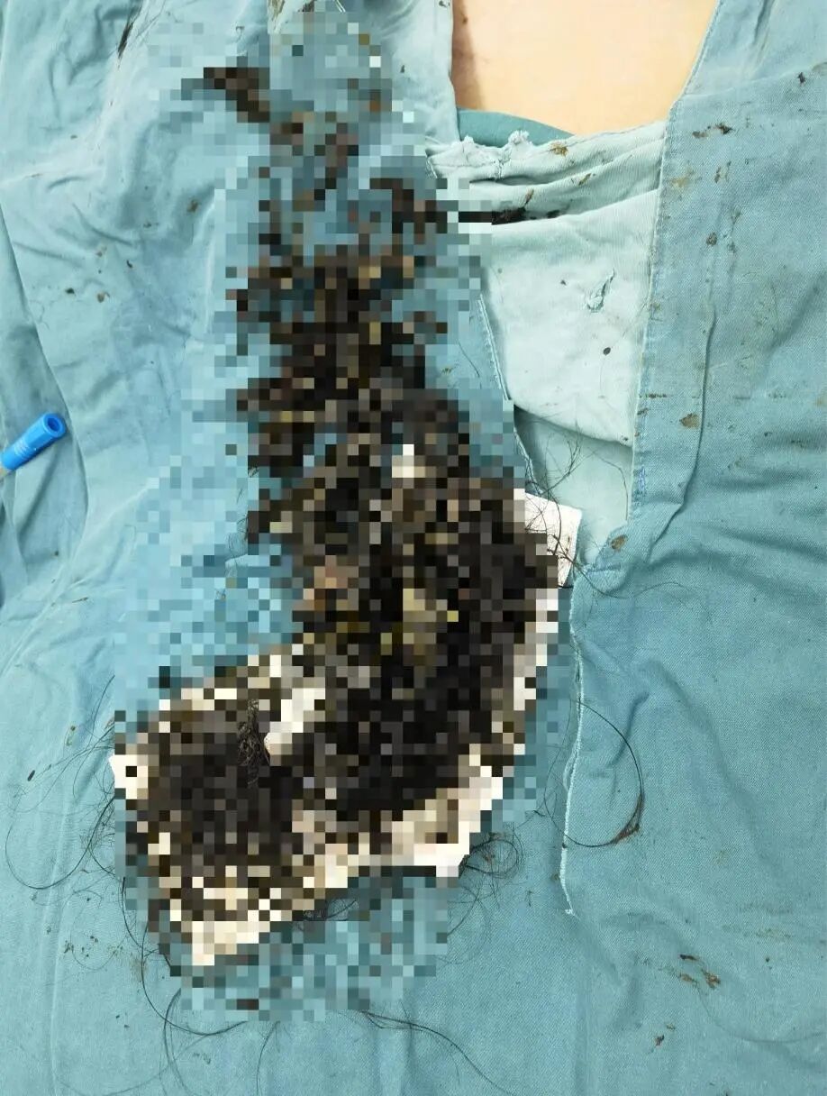 检查结果却让医生和父母都很吃惊:孩子胃里有一大团丝状异物,看样子像是头发,占据了2/3胃腔。