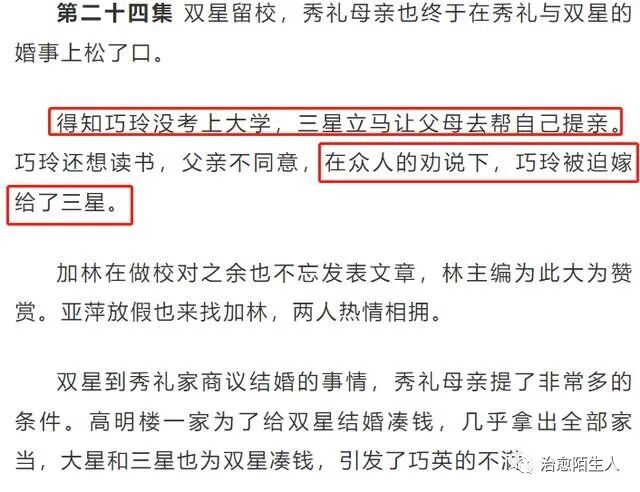 巧玲更像女版的高加林,最初她也与三星情投意合,青梅竹马,但时间久了巧玲越来越发现与三星并不合适,因此也曾拒绝三星继续对自己的示好,然而一切回到了原点,巧玲没办法靠文化逆天改命了,只能待在山沟沟里,本就不喜欢读书的三星反倒成了她的不二之选。