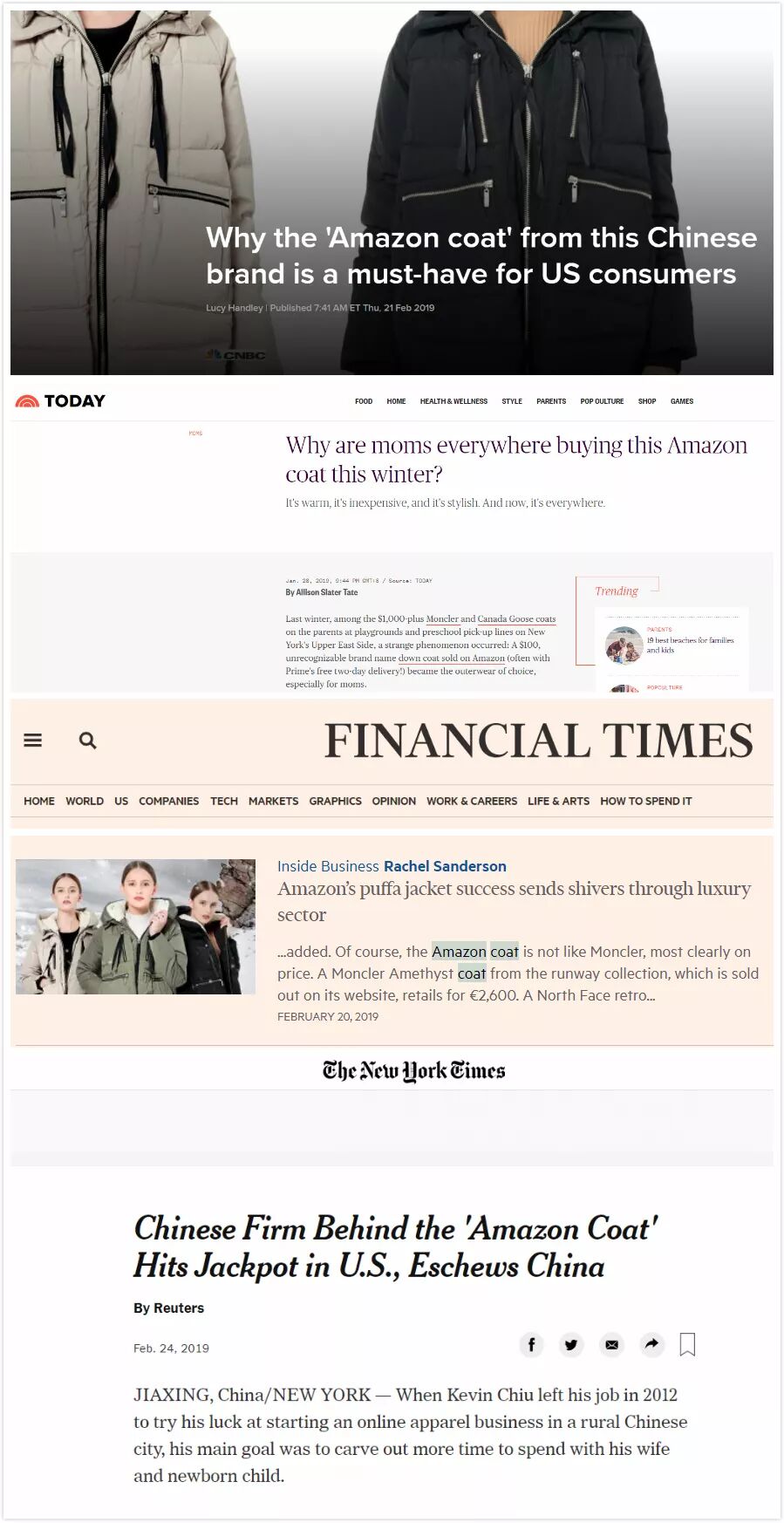 Kevin表示自己的“Amazon Coat”将不会是个例,未来肯定还会有许多被称为“Amazon X”的中国品牌和优质产品出现。