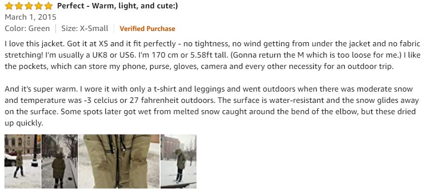 ●我超爱这件外套。XS号对我来说非常合身 – 穿上一点也不紧绷,也不会漏风,做工十分精细也不会变形!我本人1米7(5.58英尺),一般买UK8或者US6。(我准备把M号退回去,因为对我来说有点大了)。
