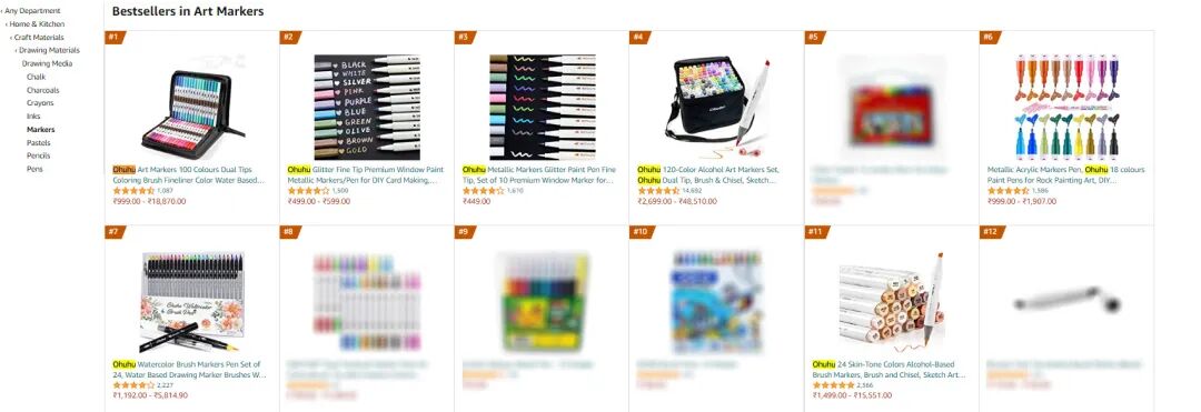 在亚马逊印度站搜索关键词Marker Pen,可以搜到30来个大牌,10000来款五花八门的马克笔。即使在这个快速迭代的品类,Ohuhu的爆款马克笔也没有被拍死在沙滩上,稳居榜首好多年,卖爆万单。