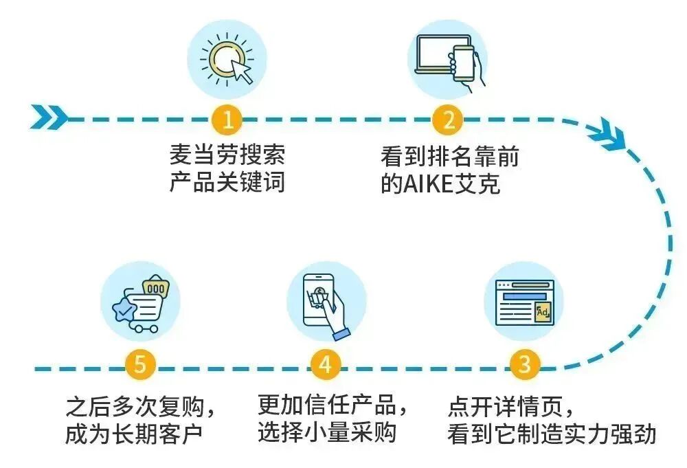 麦当劳正是通过关键词搜索,看到了AIKE艾克的相关信息,一是因为排名靠前,二是因为详情页显示的工厂实力信息,而选择了购买AIKE艾克的产品,并在几次尝试性的小量采购后进行了多次复购,现在麦当劳已经是AIKE艾克的长期客户之一了。