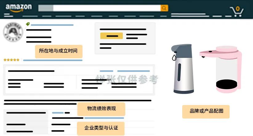 为了提升企业及机构买家的信任感,并提高购买决策转化率,AIKE艾克通过添加企业资料,完善了B端页面展示。除了固定的卖家介绍、反馈分数及QA模块,还添加了所在地、成立时间、物流业绩表现、企业类型与认证、品牌或产品配图等企业用户更关注的资料。