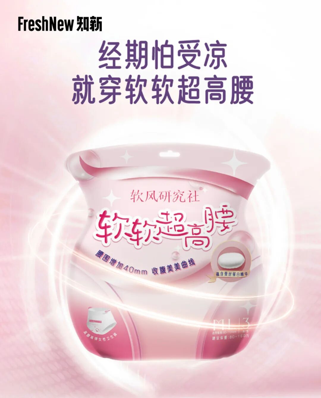 在夏天夜晚熟睡的时候,软软超高腰能够挡住肚脐,让你在空调房中免受着凉的痛楚;在办公室空调过低的时候,软软超高腰能保护经期脆弱的身体;在风大的户外,它又能帮助腹部抵御凛冽的寒风。这是「软风研究社」对女性经期痛点给出的新解法,我们希望用好产品守护每个消费者。