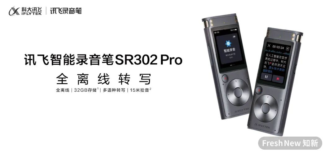 李传刚:今年9月份,我们刚刚发布了讯飞智能录音笔SR302 Pro。这是一款全离线转写的智能录音设备,有32GB大容量存储空间,具备完整的离线能力。这也是一款为公检法及特殊场景而设计的创新产品,可以说在市面上还找不到同类竞品。
