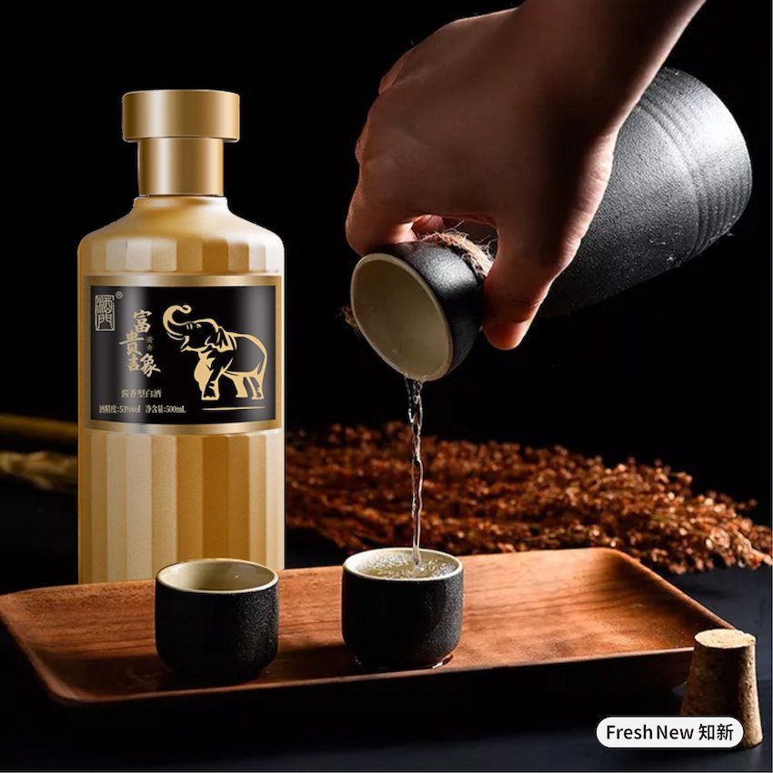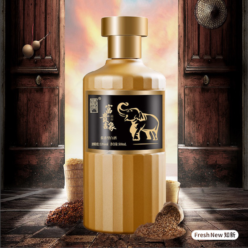 为了去强化这种关联性,我们的产品以经典黑金为配色,以此来与大象低调庄重但孔武有力的形象作为呼应。同时,在酒质方面我们也下足了功夫,选用了8年窖藏的茅台镇优级酱酒,确保这款酒既有颜值又有内涵。这样的设定,让「富贵吉象」非常适合作为商务宴请、祝寿和送礼答谢的品质佳酿。