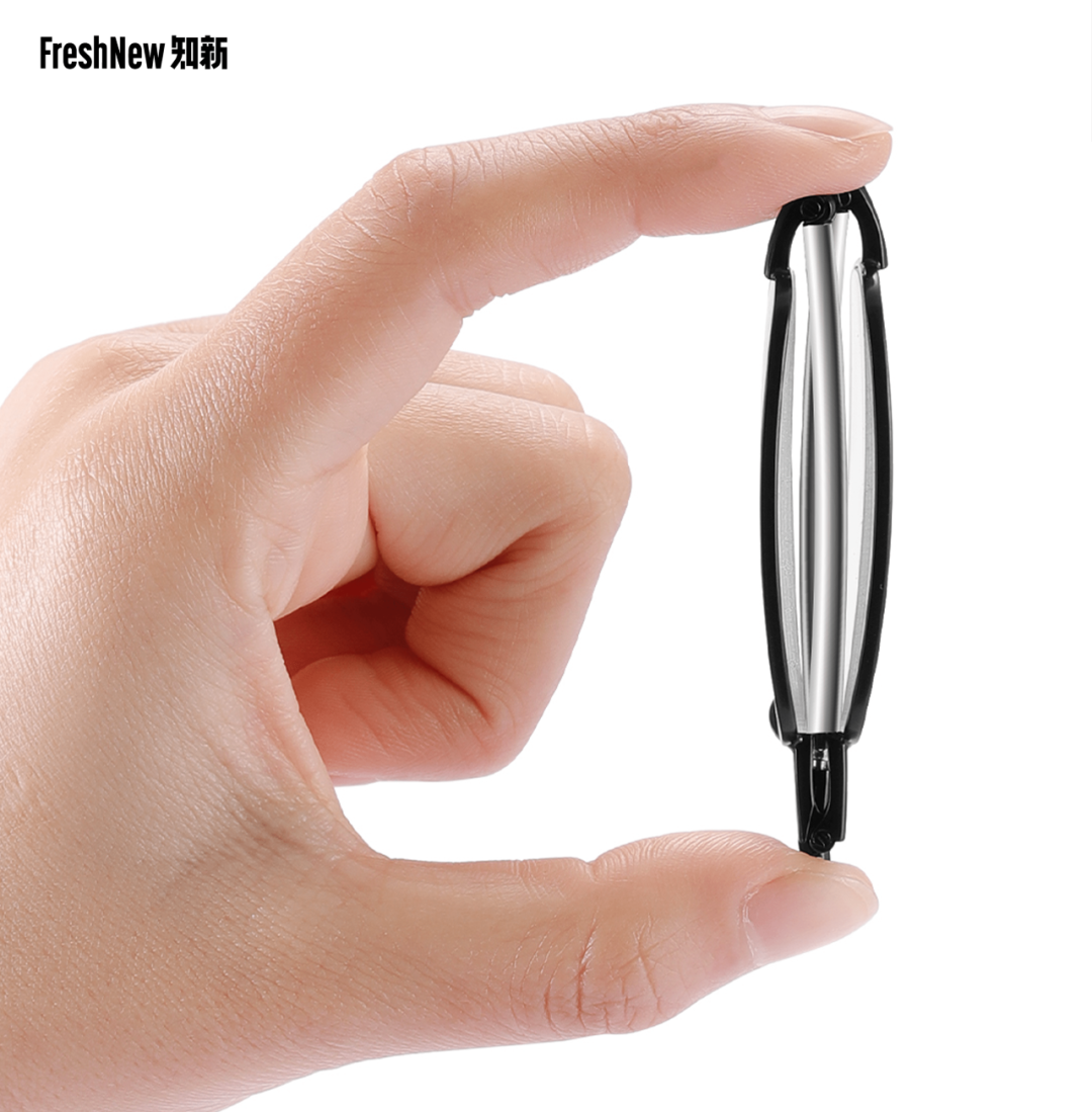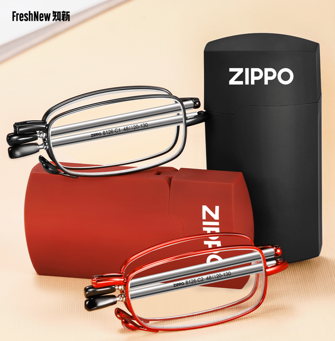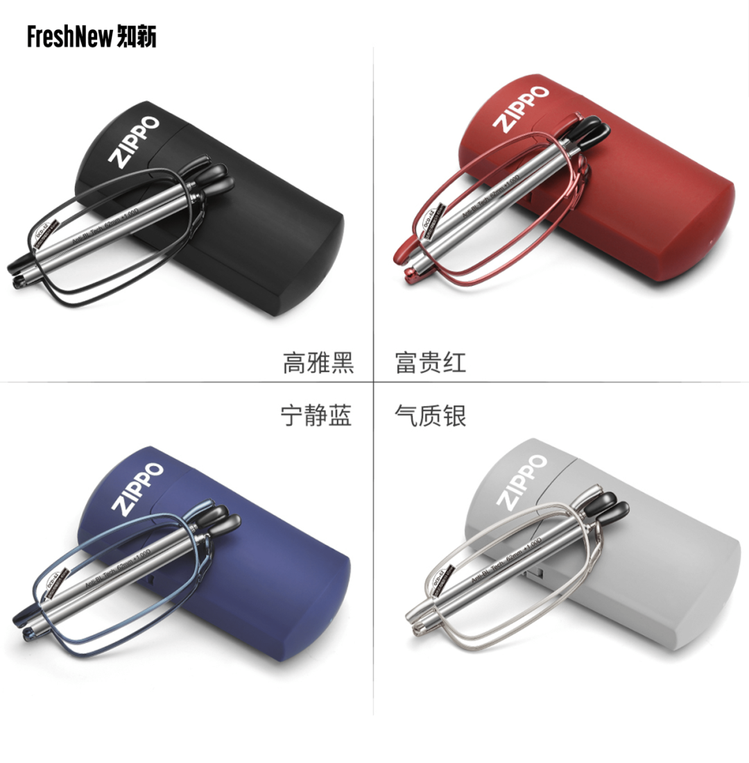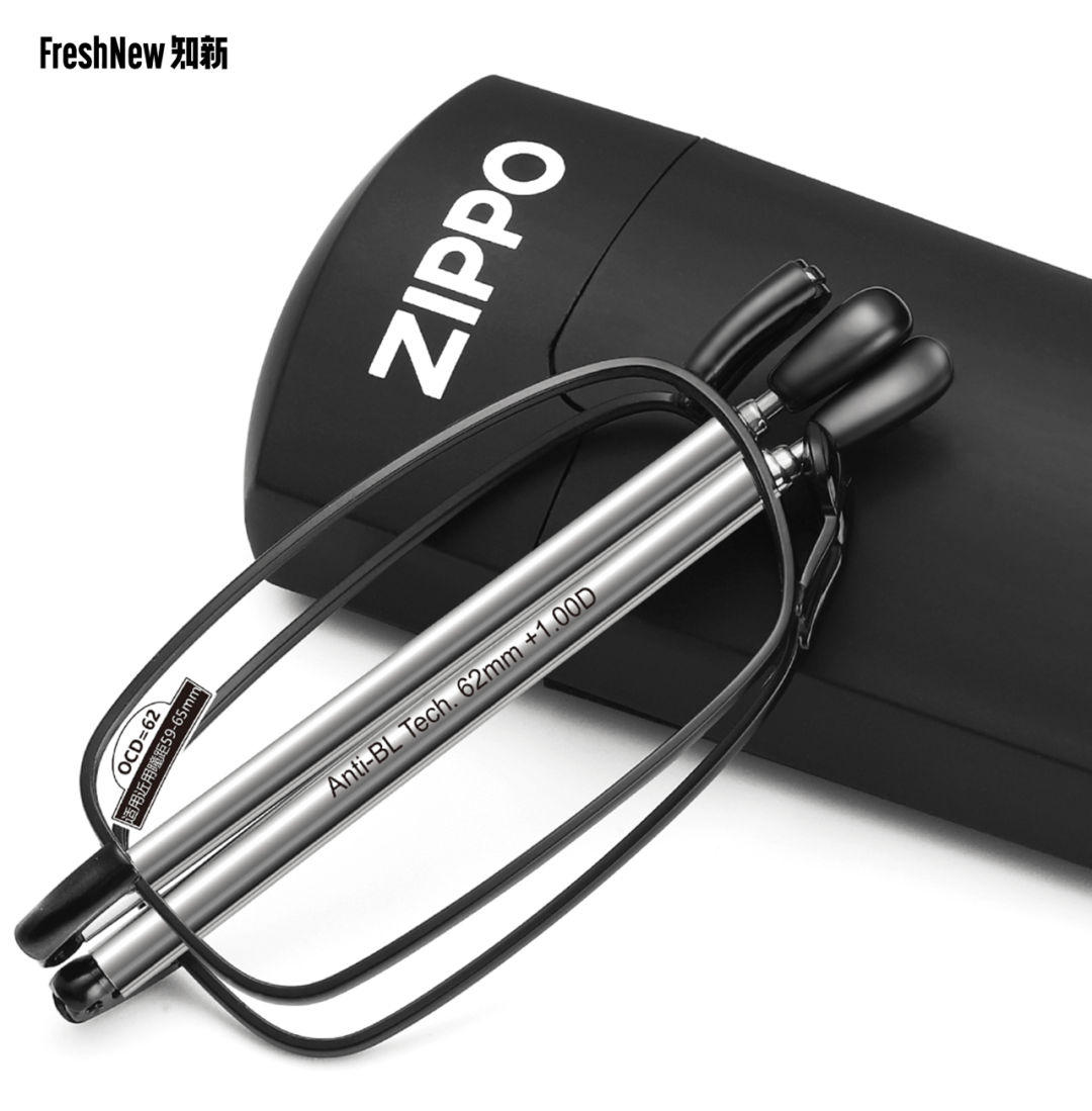 我们这款老花镜镜架,通体采用不锈钢材质,坚固与轻薄兼备,总体质量仅约十克,三秒即可轻松折叠,折叠后的尺寸比我们的「ZIPPO」打火机还要小,便携度能够满足多种场景需求。