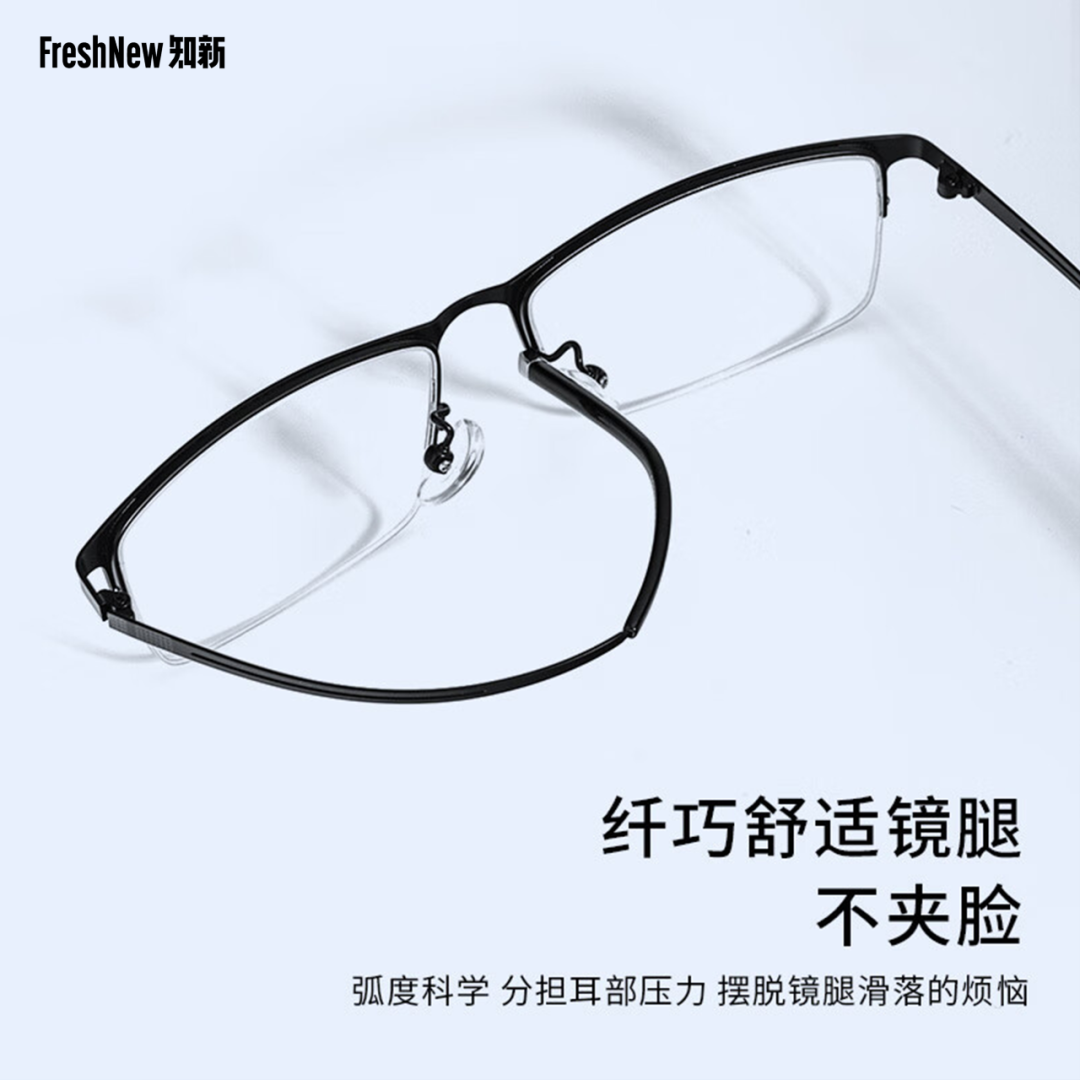 此外,这款镜架拥有纤巧舒适的镜腿,弧度设计科学不夹脸,能分担耳部压力,摆脱镜腿滑落的烦恼;柔软的鼻托使用的是亲肤硅胶材质,让消费者告别鼻梁红印的痛苦与尴尬;半框眼镜架介于全框和无框之间,集轻巧与稳重风格于一体,既有时尚感又有商务范。