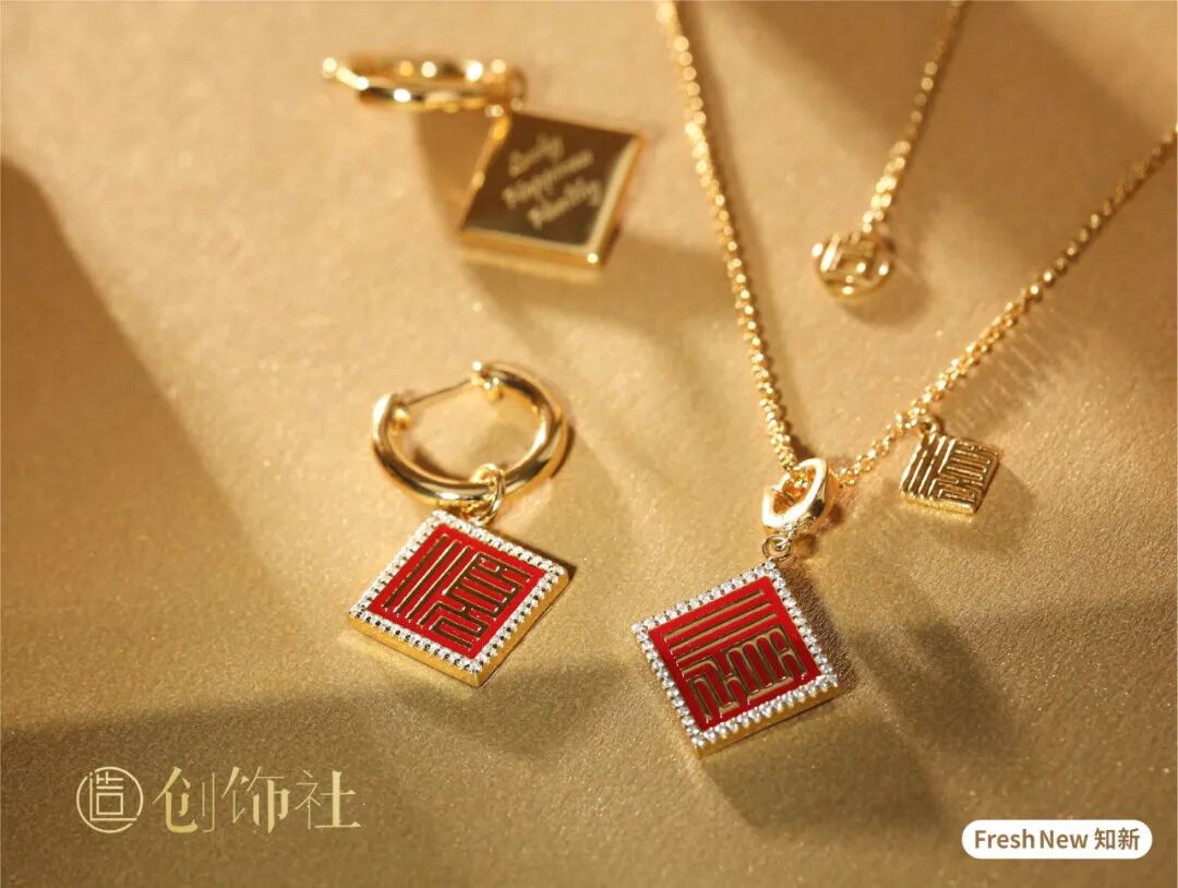 其中一套是将篆体的「顺」字与当代设计理念相融合,再用接近珠宝级的满镶锆石工艺使之足够精致,视觉冲击力和高级感都很强,大面积的金色闪耀夺目,看起来简约时髦又有文化底蕴。