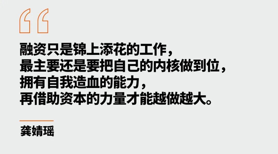 “我们融资一定要有明确的目标,根据目标再做测算,需要多少钱就融多少,绝不会过多的融资。”她认为,融资只是锦上添花的工作,最主要还是要把自己的内核做到位,拥有自我造血的能力,再借助资本的力量才能够越做越大。