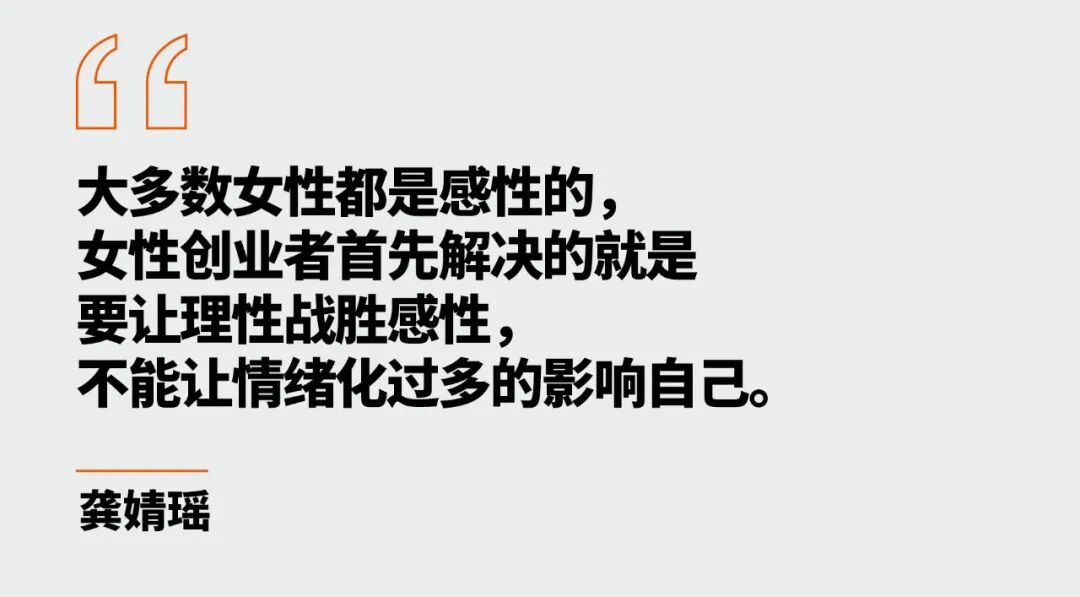 在龚婧瑶看来,大多数女性都是感性的,女性创业者首先解决的就是要让理性战胜感性,不能让情绪化过多的影响自己。