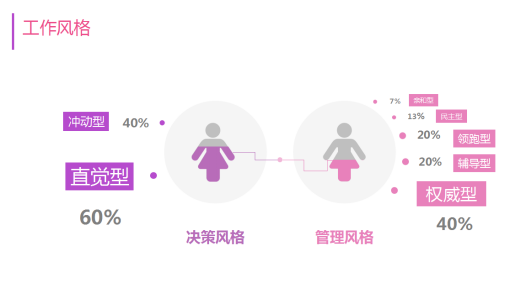 调研数据显示,在工作中,30位上榜女性创业者的管理风格偏向于权威型——更看重结果,其他的大家自由发挥,占比达40%,其次为辅导型——长期陪跑,培养面向未来的员工,以及领跑型——身先士卒,我能做到,他们也能做到,两者占分别为20%。此外,在决策风格上,她们更倾向于直觉型——感觉对了就对了,占比60%,超过一半,其次为冲动型——机不可失,先干再说,占比40%。