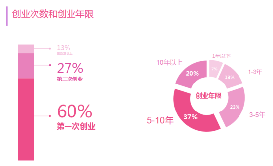调研数据显示,30位上榜的女性创业者中超过一半为首次创业,占比为60%,此外,从创业年限来看,超过一半为5年以上,其中,20%的女性创业者创业年限在10年及以上。由此可见,女性的韧性和坚持,在选择创业这条路后充分显现出来。