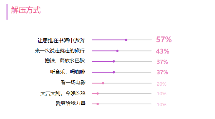 调研数据显示,30位上榜女性创业者中有21位目前工作“压力一般,在适当范围内”,占比70%。同时,通过调研我们了解到,读书、旅行、撸铁、听音乐已成为她们当下最喜欢的解压方式,其中读书占比最高,为57%,从她们推荐的书籍来看,刘慈欣的科幻小说《三体》备受推崇。
