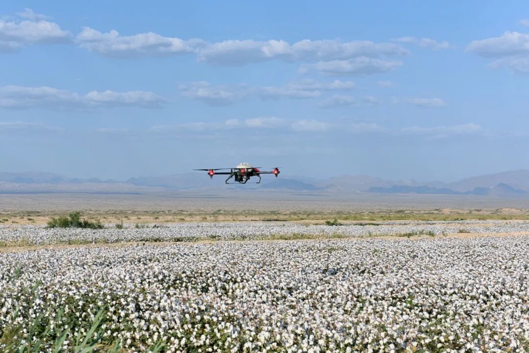 棉田上空作业的无人机 棉花种植是极飞科技在农业中落地的第一个场景 图片来源:极飞科技