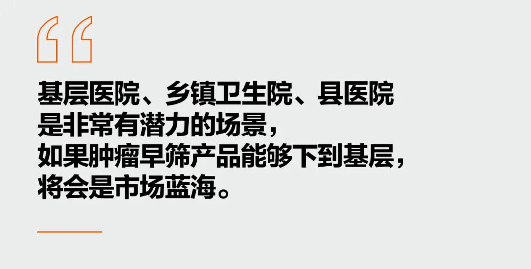 “癌症伴随诊断的患者非常集中,可能将近80%的患者都集中在5%到10%有疑难癌症诊断和治疗能力的大三甲医院,商业化场景单一。而肿瘤早筛的商业化场景非常丰富,除去做健康体检的体检中心外,基层医院、乡镇卫生院、县医院是非常有潜力的场景,如果肿瘤早筛产品能够下到基层,将会是市场蓝海。”张江立说道。