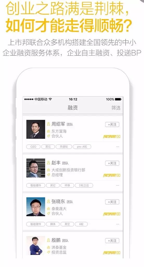 说了这么多,你也许还想要知道撮合的效果如何。截至目前,在上市邦撮合成功的融资总量已经超过3亿元人民币。已经与32家投资机构建立战略合作关系,与63家孵化器建立合作关系,与此同时我们还正在推进12个FA项目。