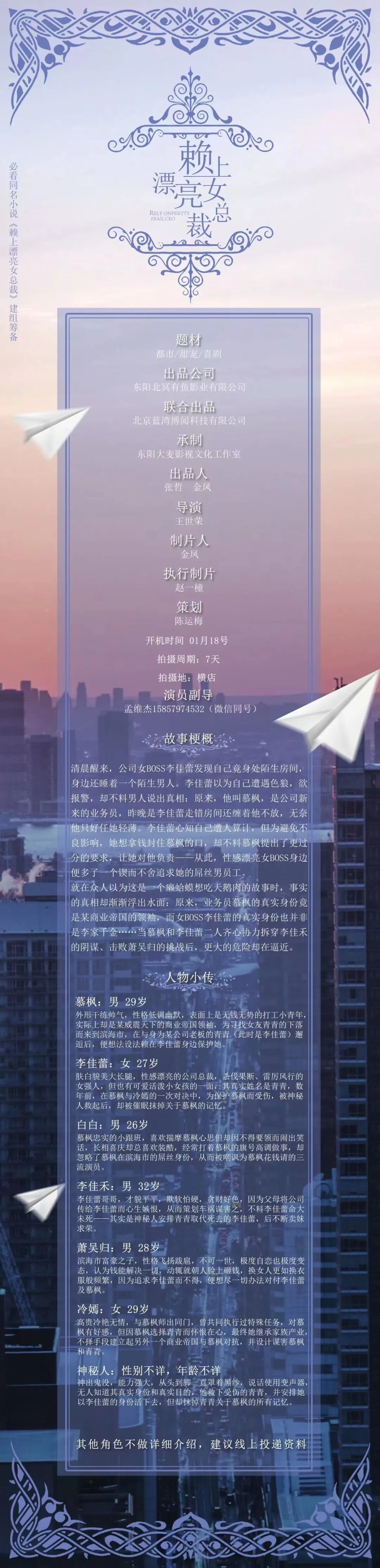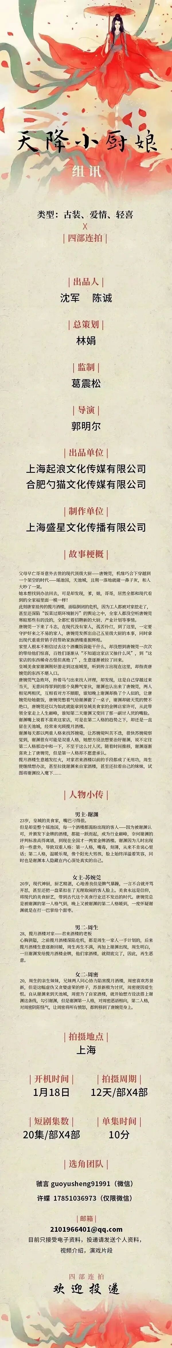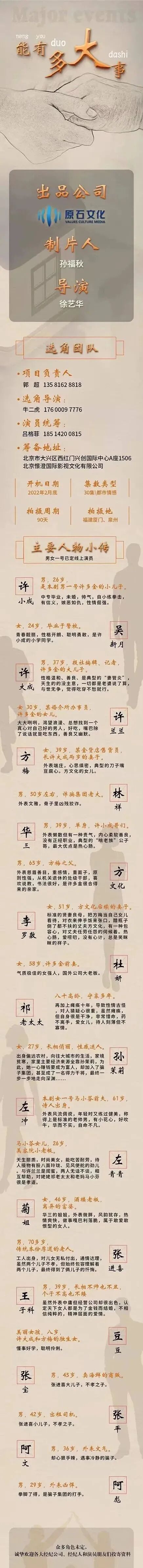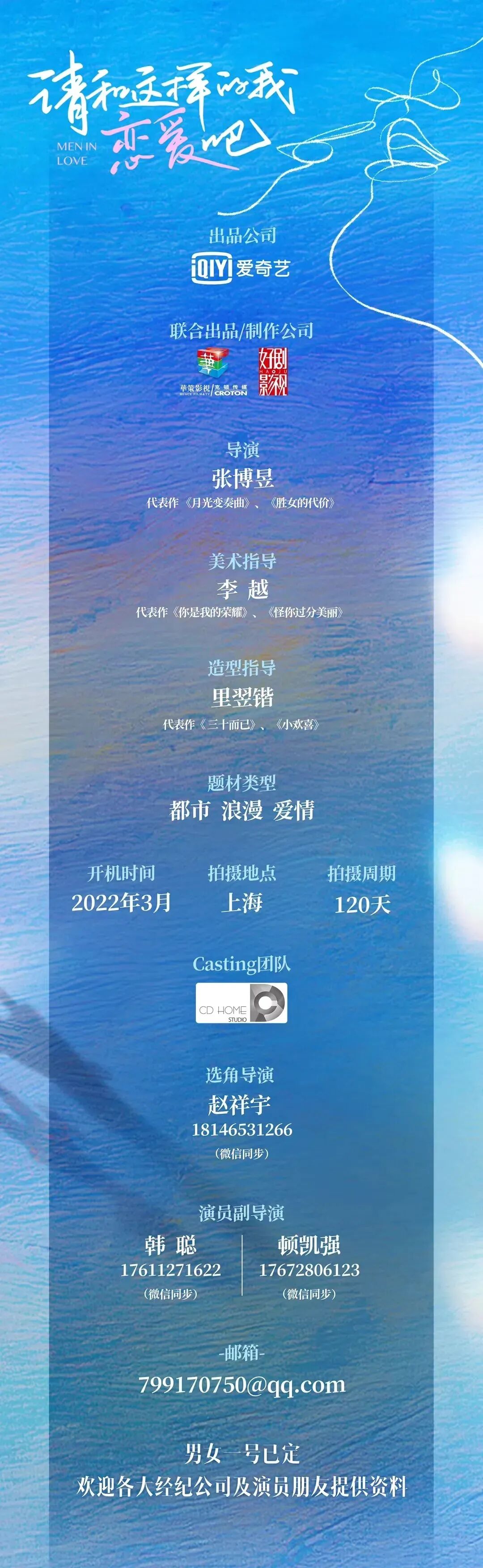 众多角色未定,诚挚欢迎各大经纪公司、经纪人和演员朋友们投寄资料。