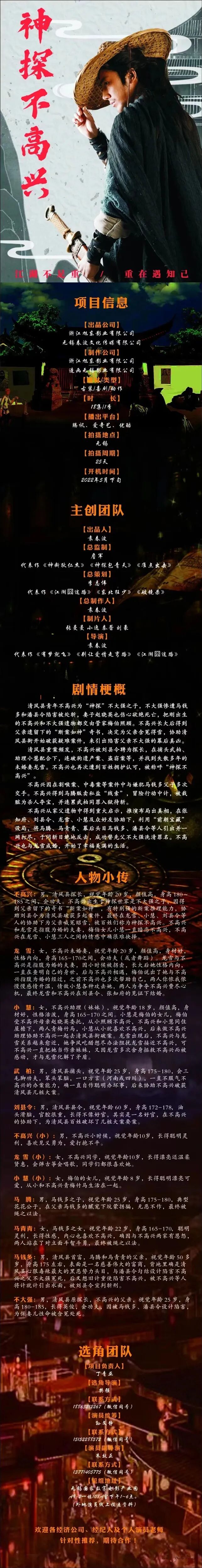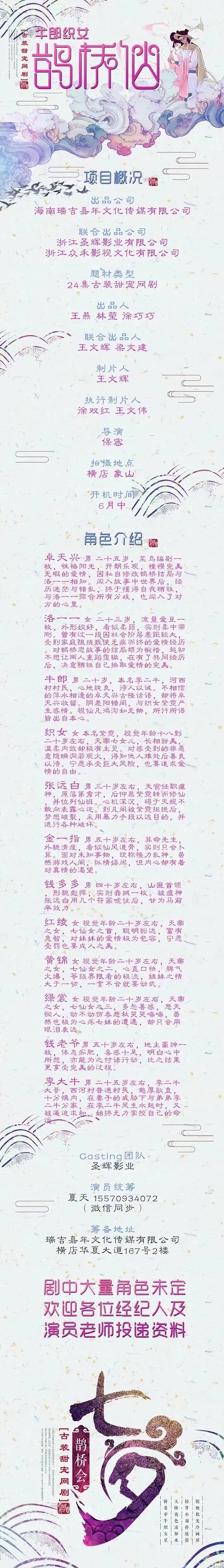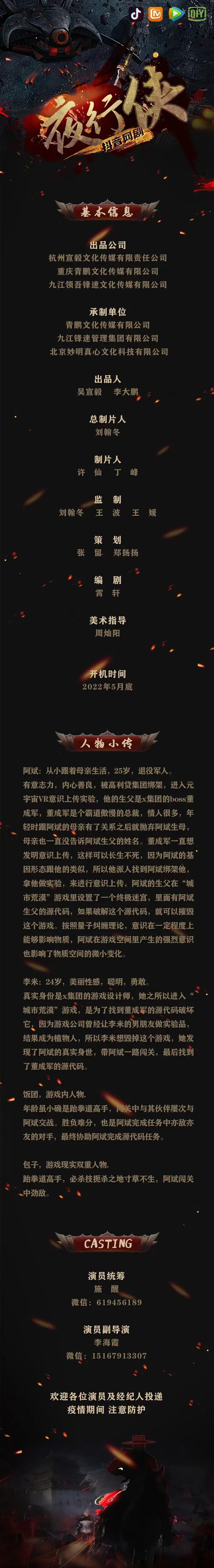 剧中大量角色未定,欢迎各位经纪人及演员老师投递资料。