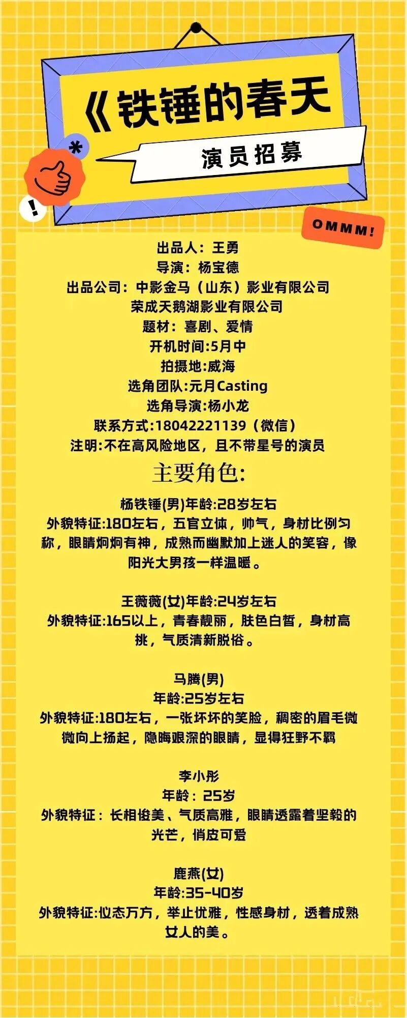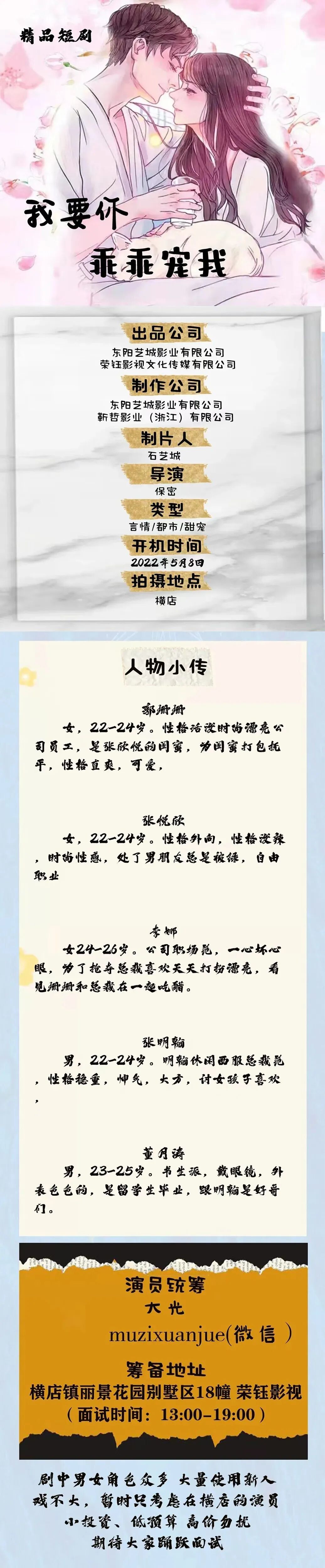 剧中男女角色众多大量使用新人,戏不大,暂时只考虑在横店的演员,小投资、低预算高价勿扰,期待大家踊跃面试。