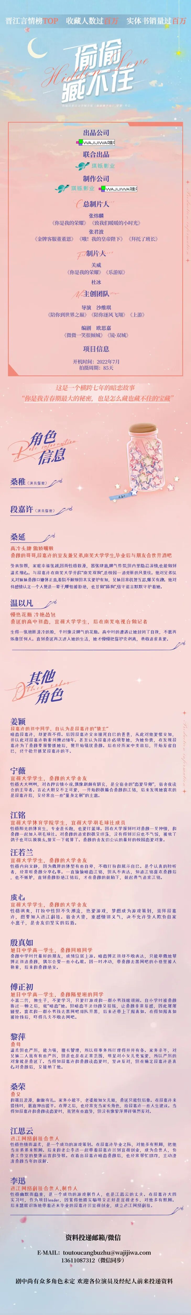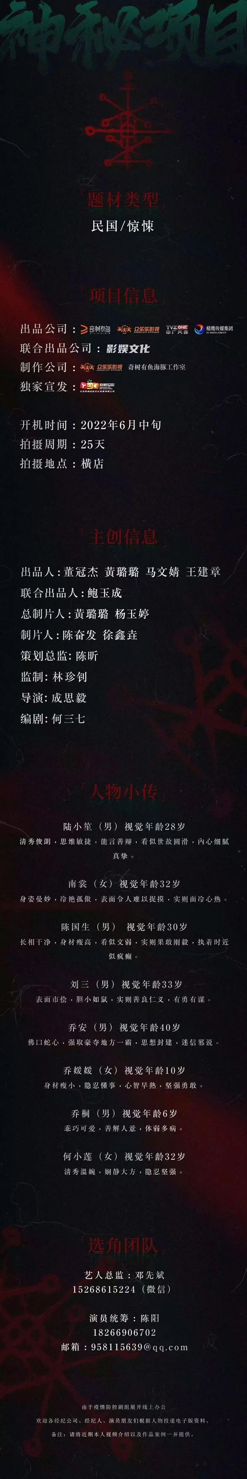 剧中尚有众多角色未定,欢迎各位演员及经纪人前来投递资料。