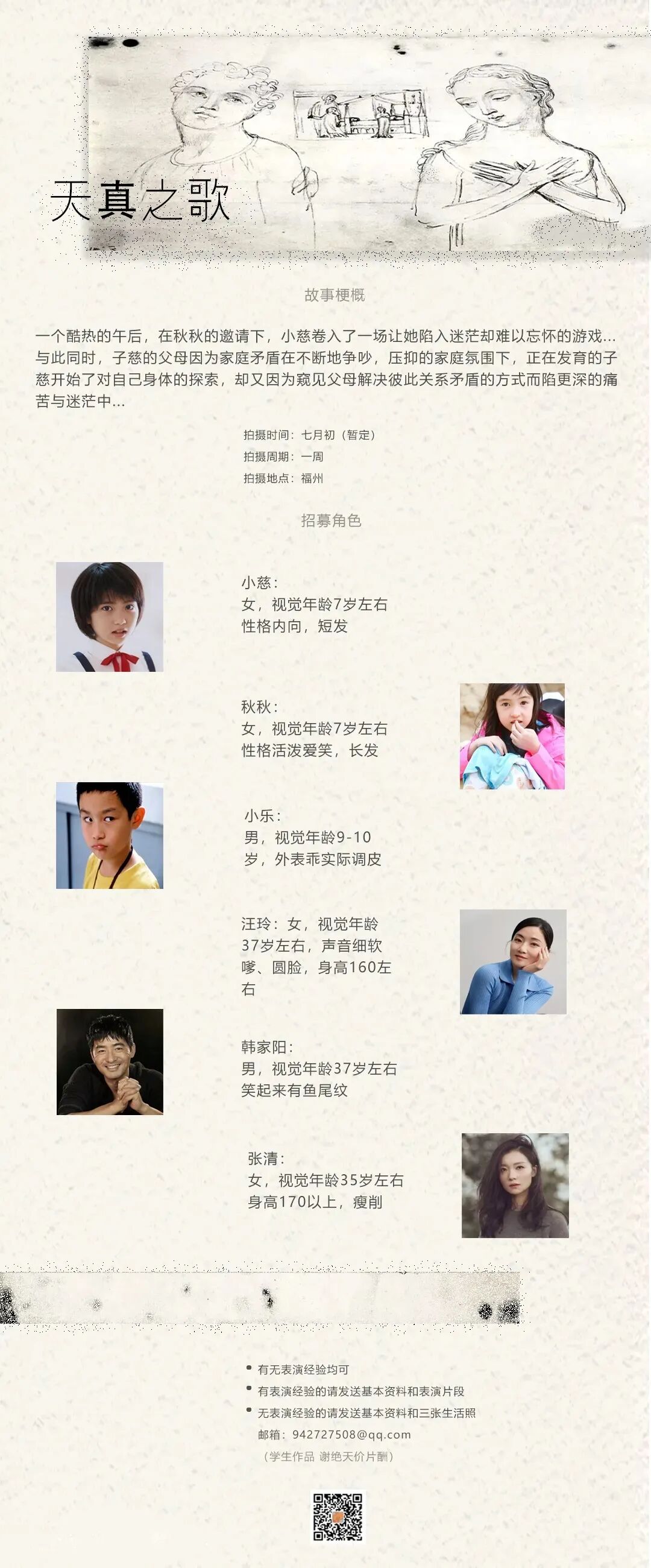 有无表演经验均可,有表演经验的请发送基本资料和表演片段,无表演经验的请发送基本资料和三张生活照
