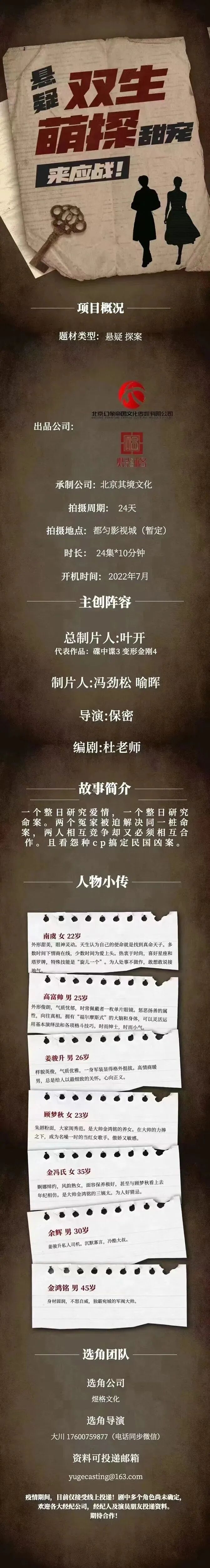本栏目发布组讯由小编采集与业界共享,组讯如有变化请以实际情况为准。如果遇到剧组收费情况,请谨慎对待并私信官微@戏客Seeker,我们会公示问题组讯并及时处理。谢谢。